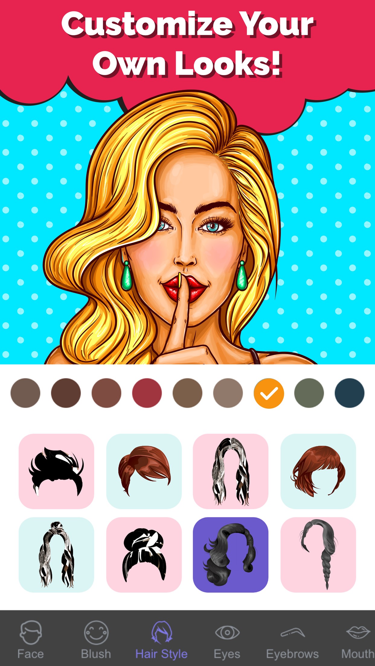 • Customize the shape and color of your face, look for your hairstyle and hair color, and select the eyes, eyebrows, mouth, nose, and ears that are more similar to yours, and design animated emojis that look like you.