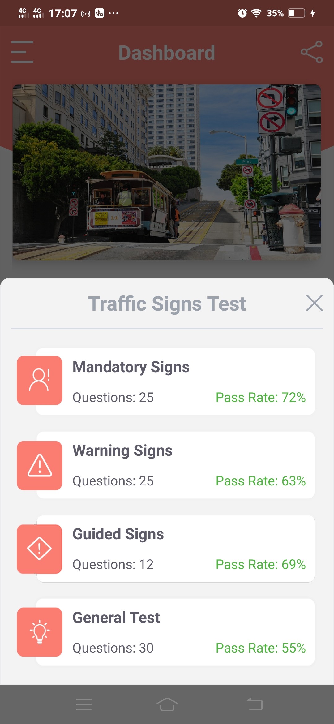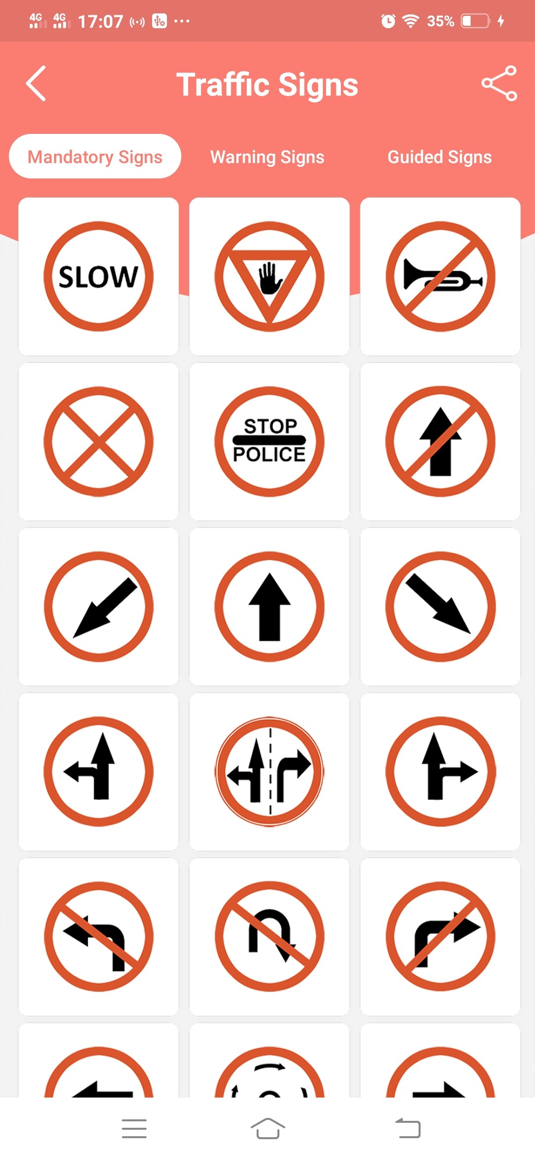Traffic learner has a variety of information divided in different sections so that you can also chose the nature of topics and questions, you need to focus on. Besides this The sample Tests also have Difficulty level so that you can hit the real Driving test like an expert. Road signs test and other mandatory traffic signals are added in quiz portion to enhance the knowledge and will help you pass your driving license test easily.