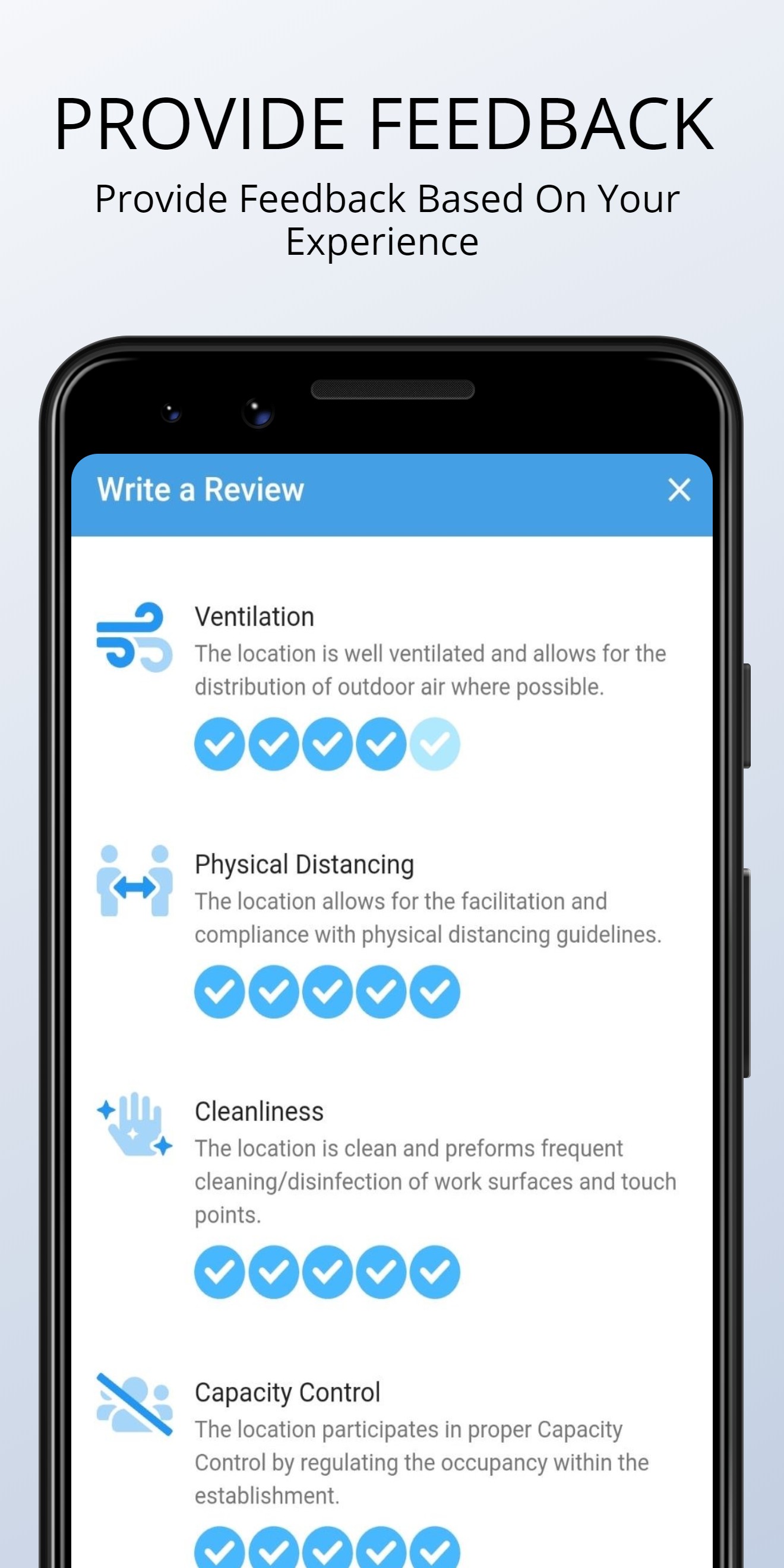 Ratings and Reviews are broken down and easy to understand with our 5 categories: Ventilation, Physical Distancing, Cleanliness, Capacity Control, and Safeguards. Users will be able to individually rate each of these, allowing for a more precise, personalized review, and can even add in a personalized comment to give additional feedback on their experience. In turn, the company is then able to review the feedback, and is now more capable of making any necessary changes based on consumer opinion.