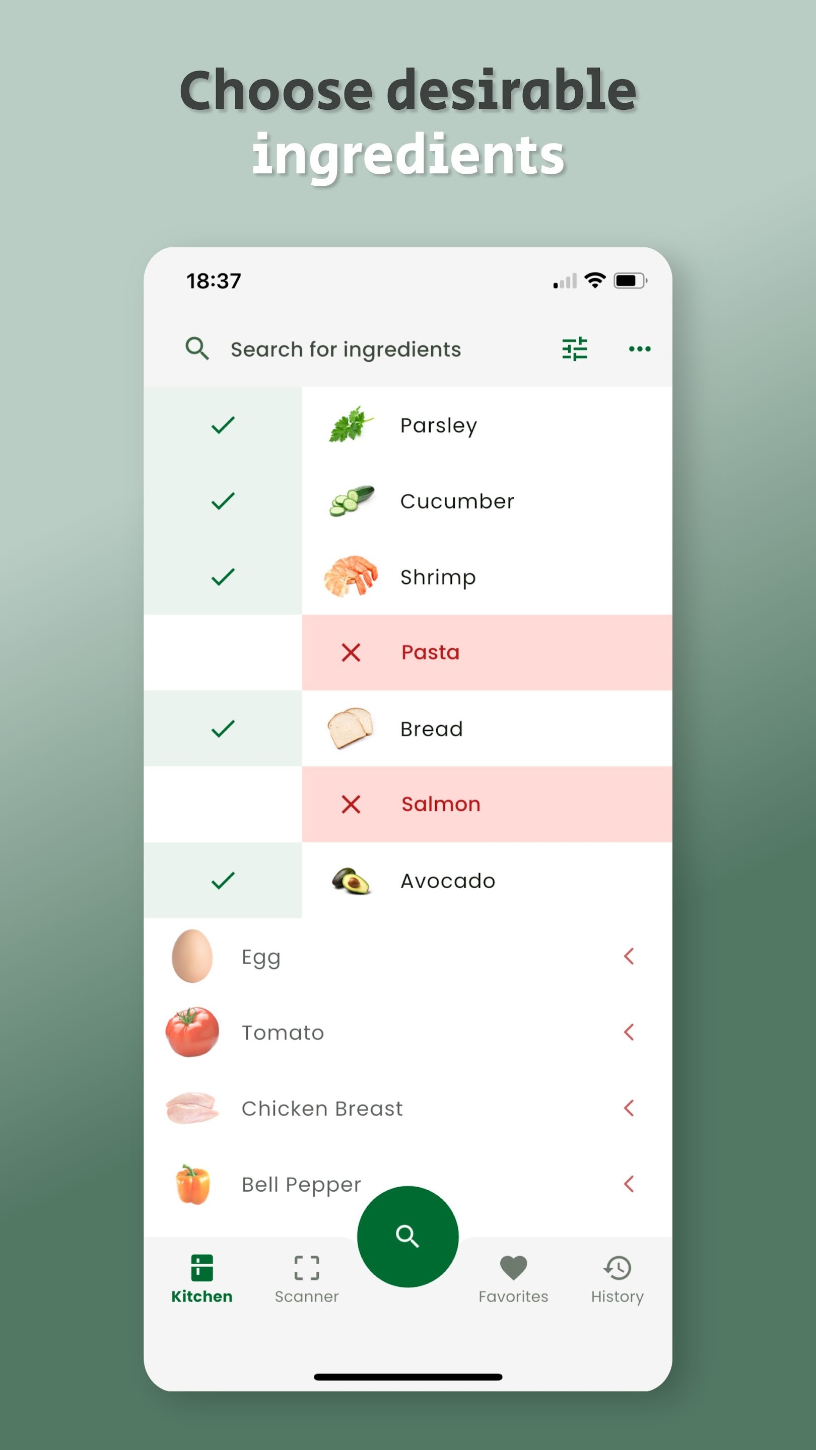 - Simple & User-Friendly: Registration is optional, but required to use Favorites. Scan My Kitchen is designed for convenience. Simply select your ingredients, filter by dietary needs or meal type, and browse a variety of recipe options.