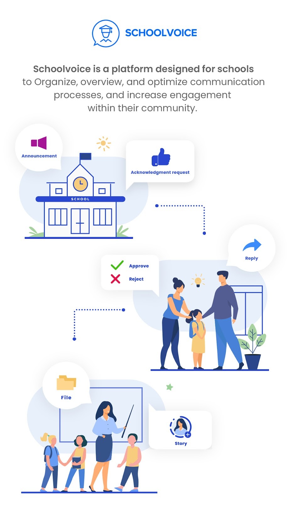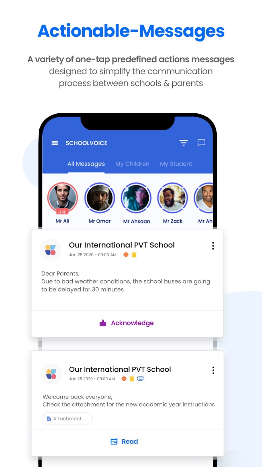 SchoolVoice is a FREE app for Android and IOS smartphones that secures instant interaction with the school of your child bringing his education, development and school updates at your convenience. SchoolVoice is your one-stop app that saves your time and gets all school messages sorted out for you to stay updated easily and instantly! SchoolVoice is your new way to communicate easily and interactively with your child’s school approving messages and declining other. SchoolVoice has tons of amazing features like reminders, emergency alert and many more for better communication and time-saving.