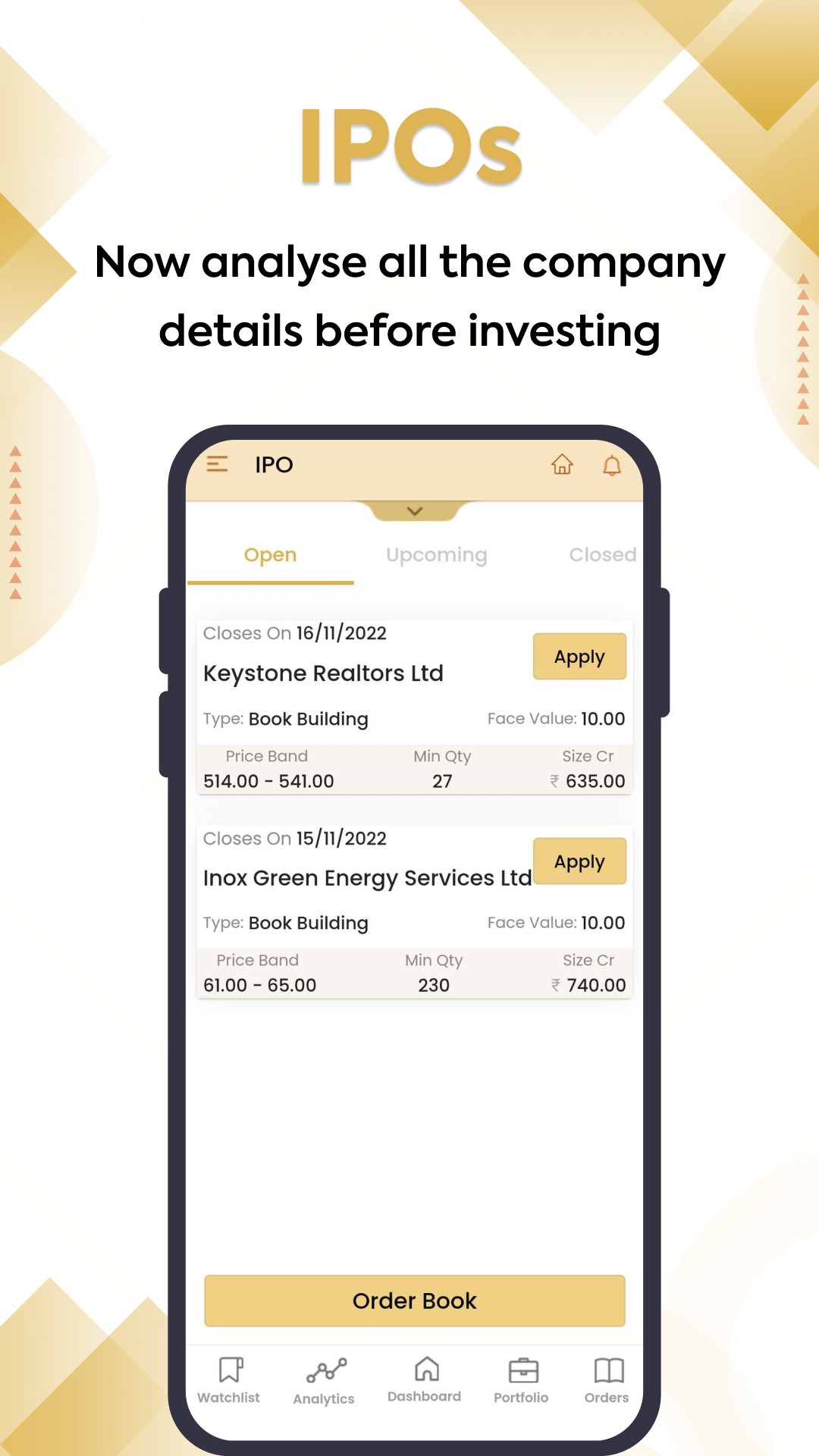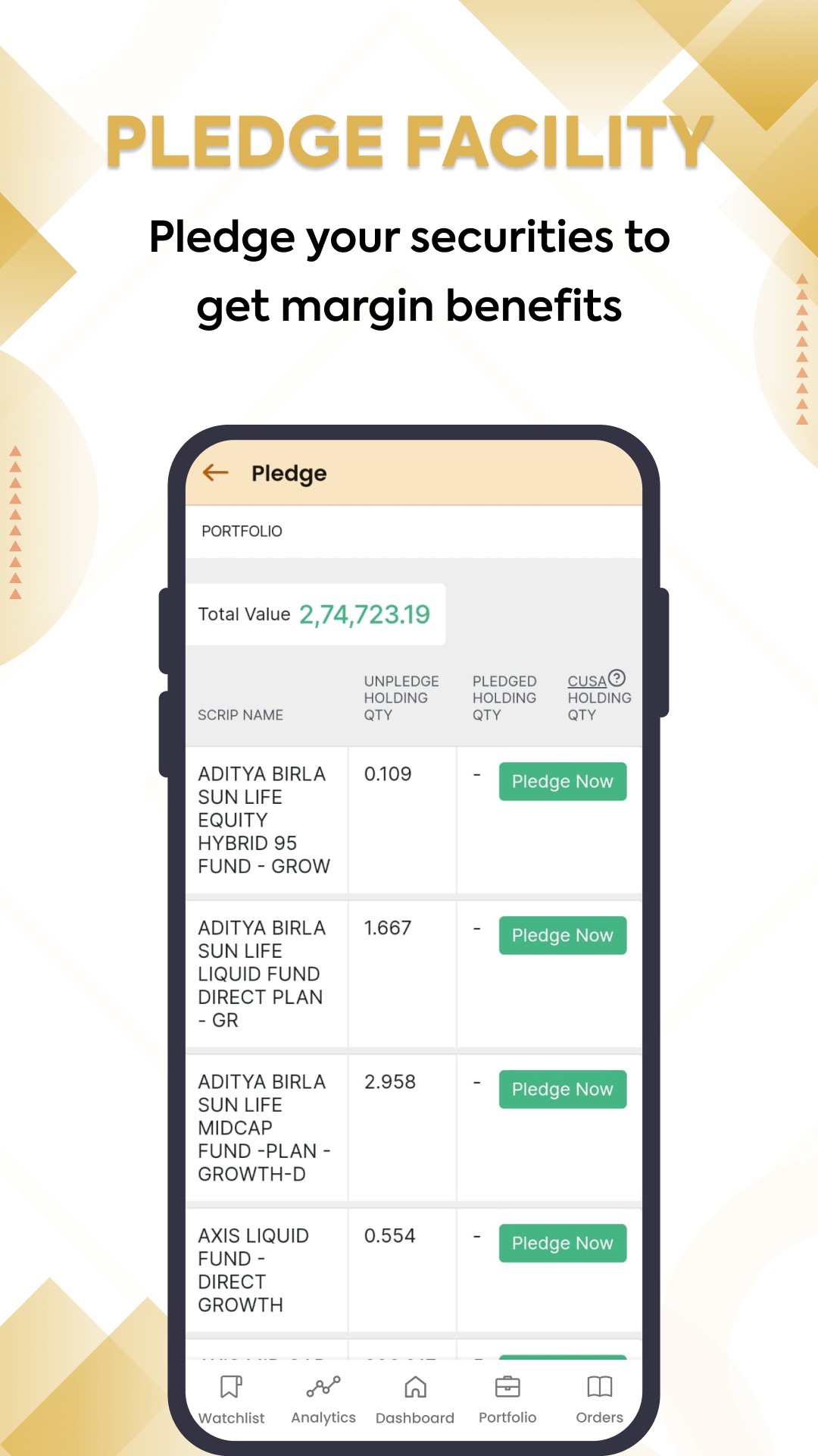 • Advanced order type including GTT (Good Till Trade) in NSE, BSE & MCX.