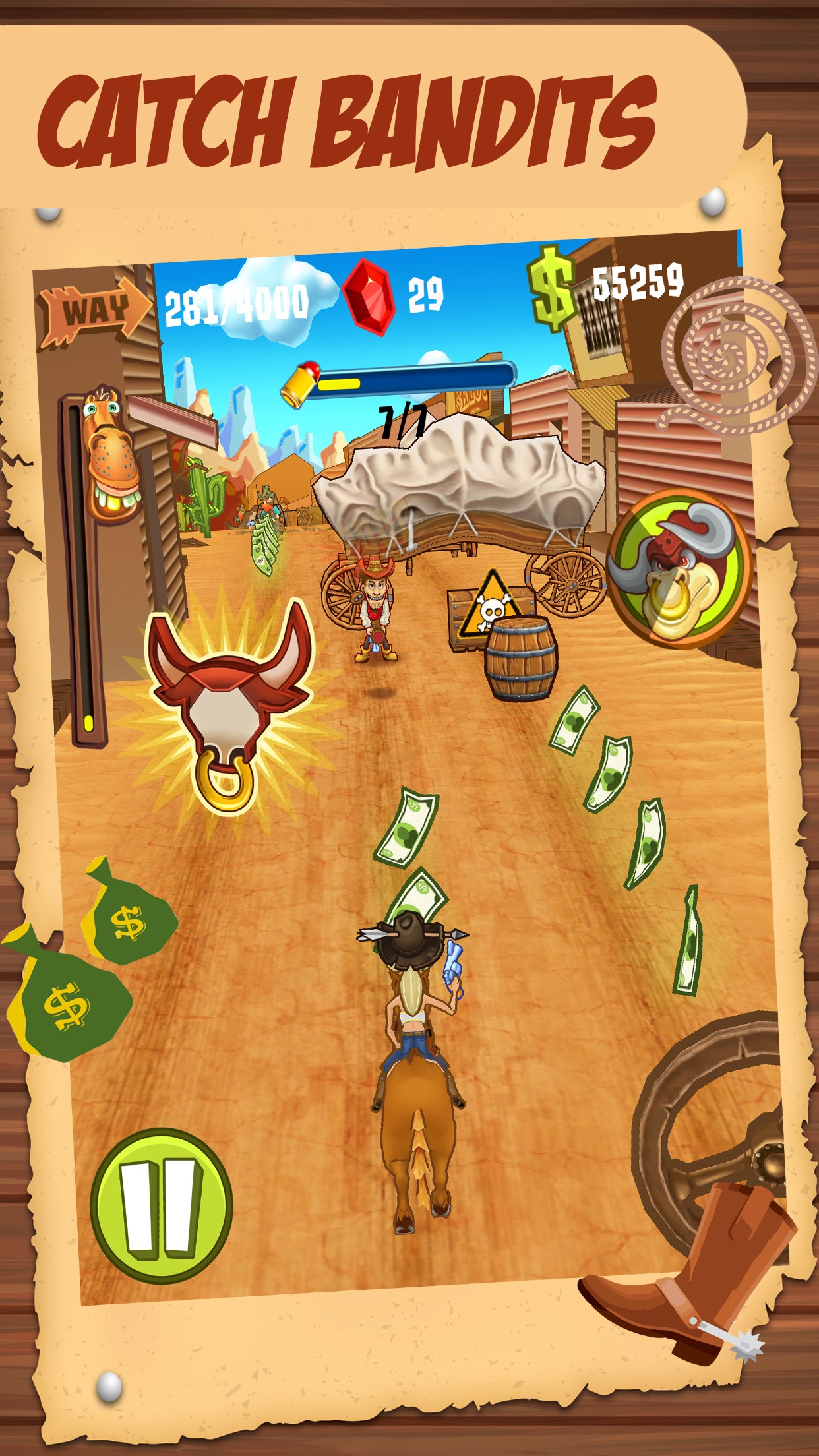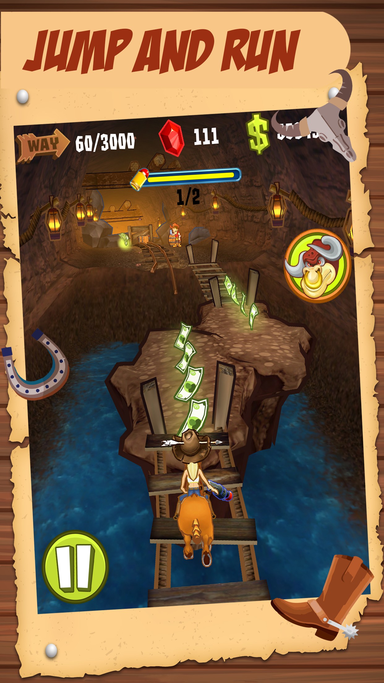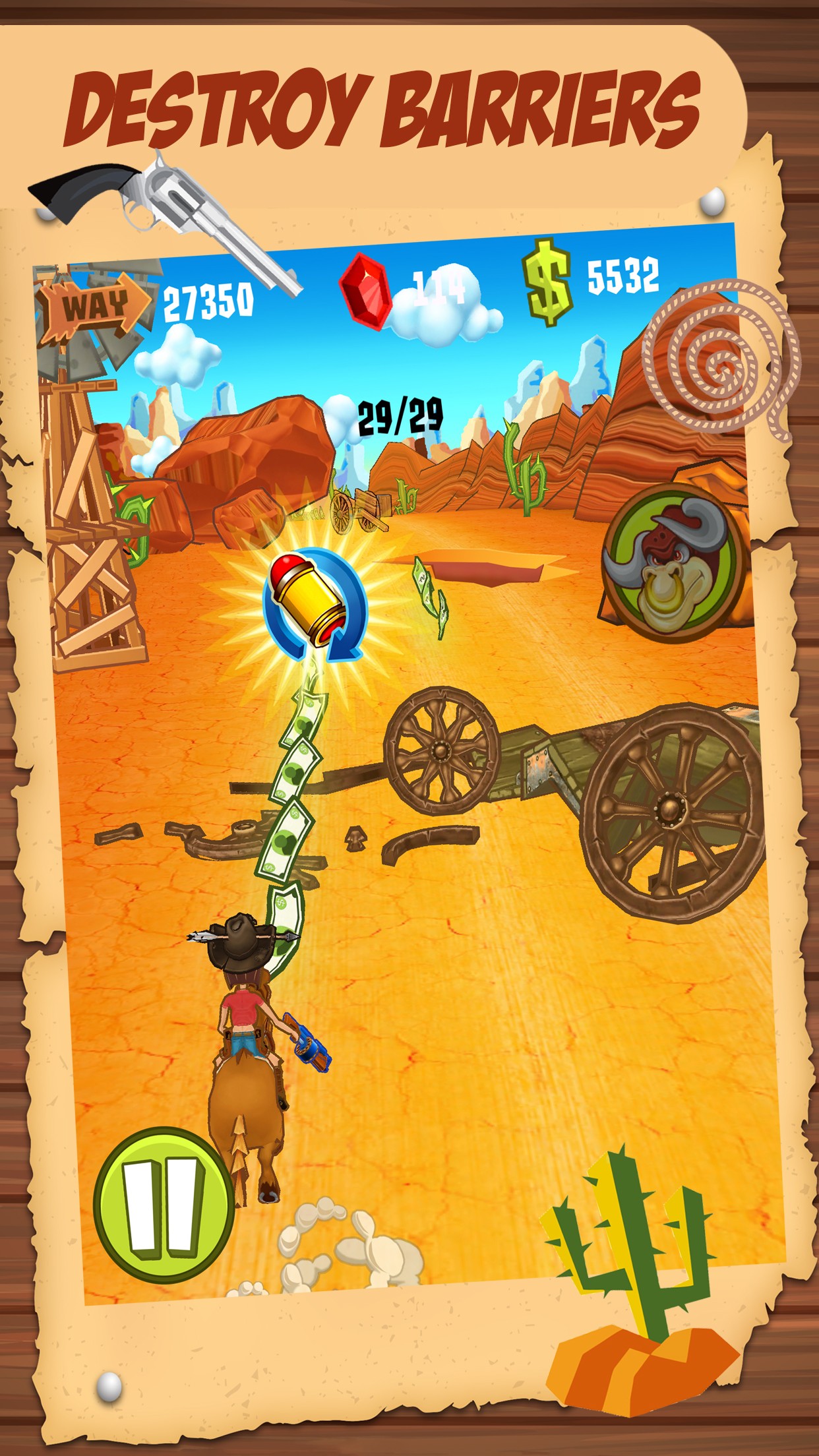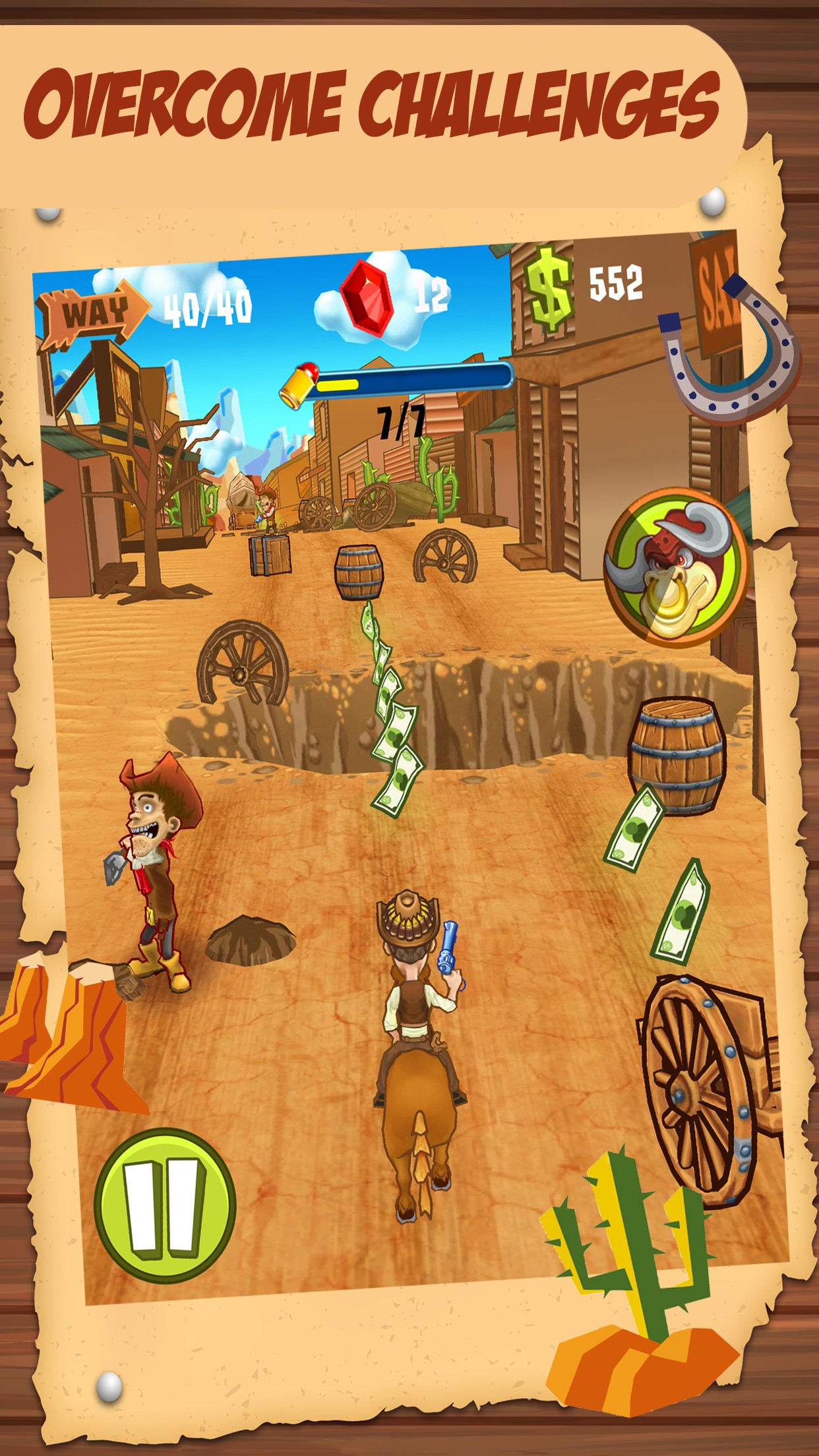 Thanks to high-quality graphics, discreet music and themed obstacles on your dangerous, full of surprises path you will be able to fully enjoy the Wild West’s atmosphere. Vehicles, cacti, revolvers, a variety of locations and the horse, which rides your cowboy - all this will help to lose yourself in the Wild West atmosphere.