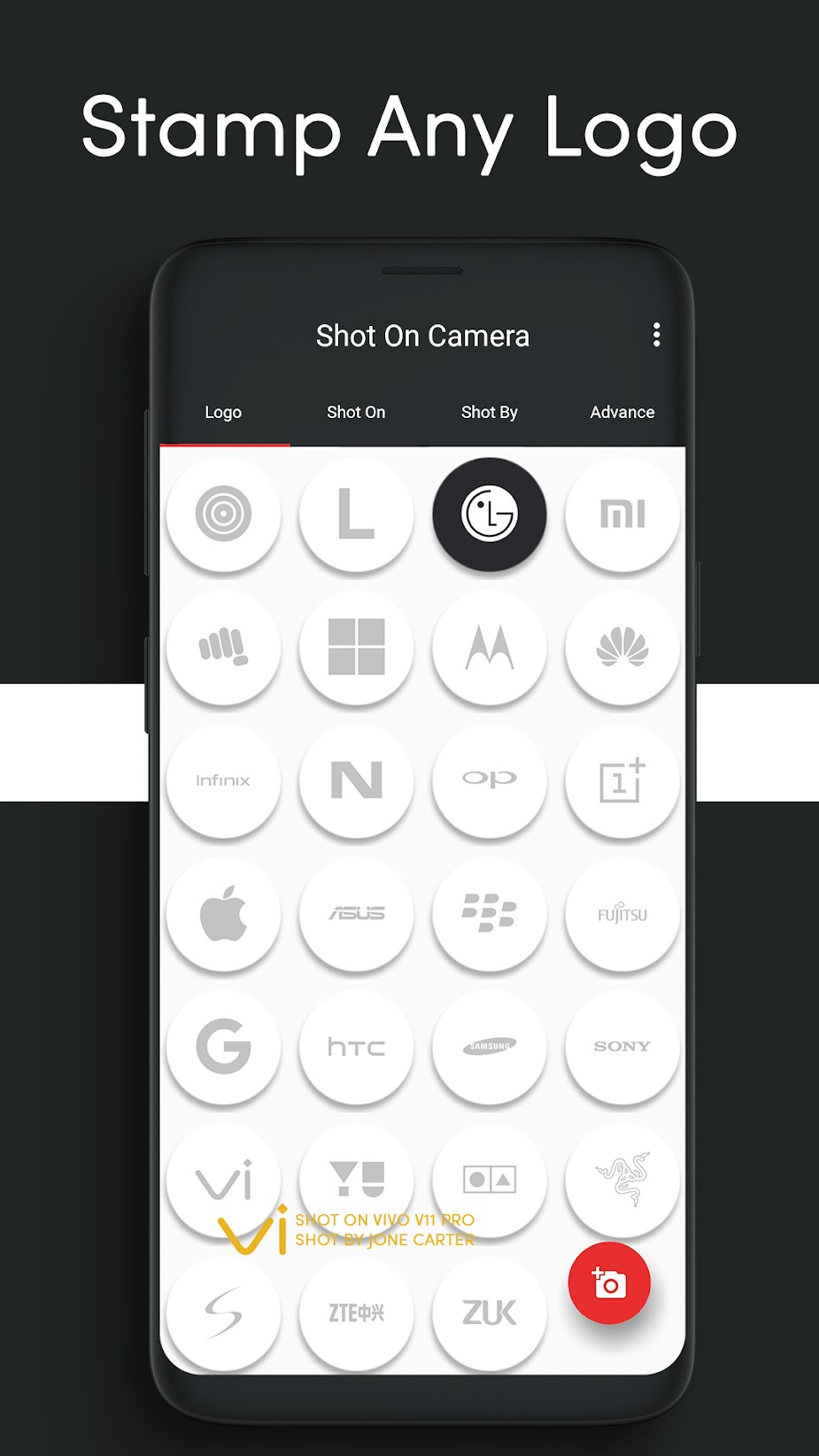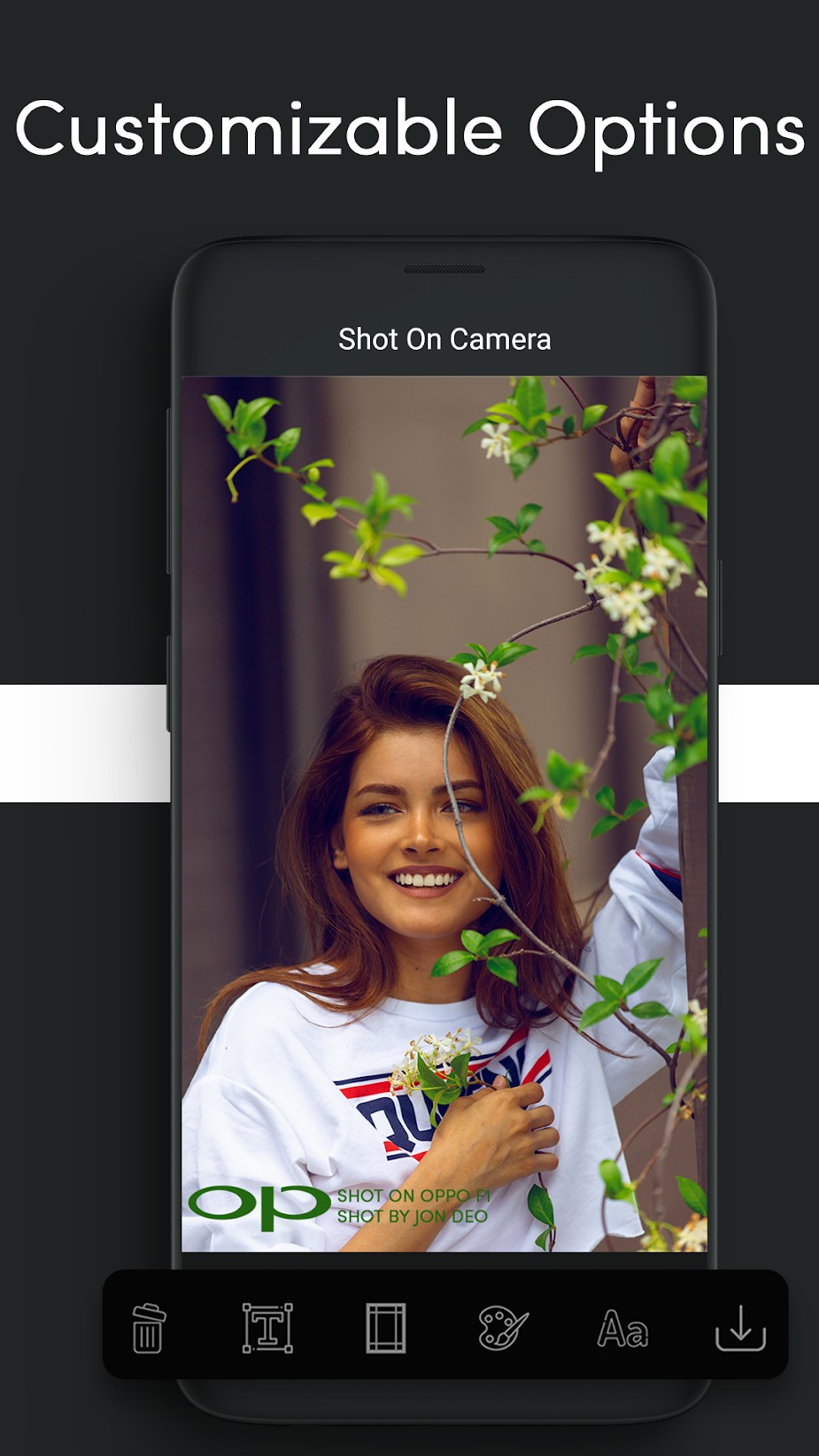 It facilitates you to choose any brand logo as per your preference along with the functionality to edit signature text e.g “Shot On (Your Device Name)” and “Shot By (Your Name)”.