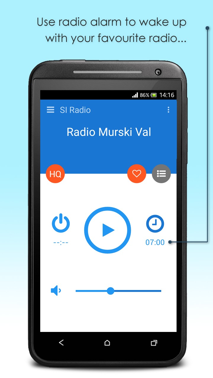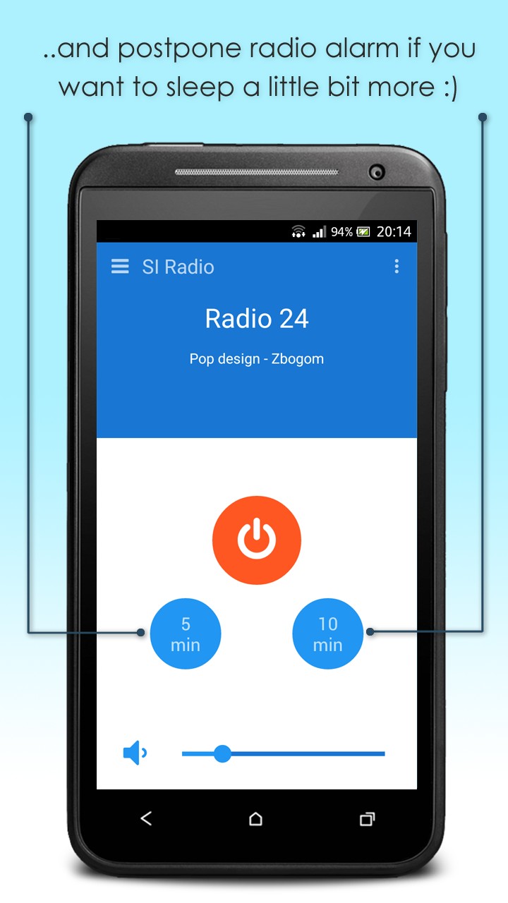 Have you already been tired of the same alarm sound, beeping every morning? You can use SI Radio also this way! Just choose your favourite Slovenian radio station and time, when alarm should be triggered and wake up every sunrise to a different music. In case you loose access to the internet over night, don't worry, application will wake you up with the default tone of you smartphone. On the other hand, if you like to fall asleep while listening to some music, but you don't want to leave it playing whole night, you can easily set it to shut down automatically after the chosen time.