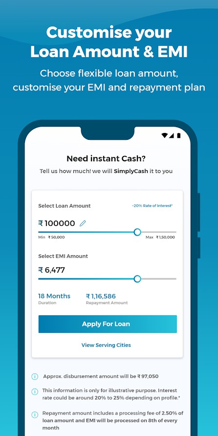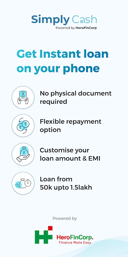 SimplyCash, powered by Hero FinCorp, is an online personal loan app that will help you with an instant personal loan in just 3 simple steps. Get an Instant Cash Loan up to ₹1.5 Lakh disbursed directly into your bank account with our super affordable personal loan interest rates.