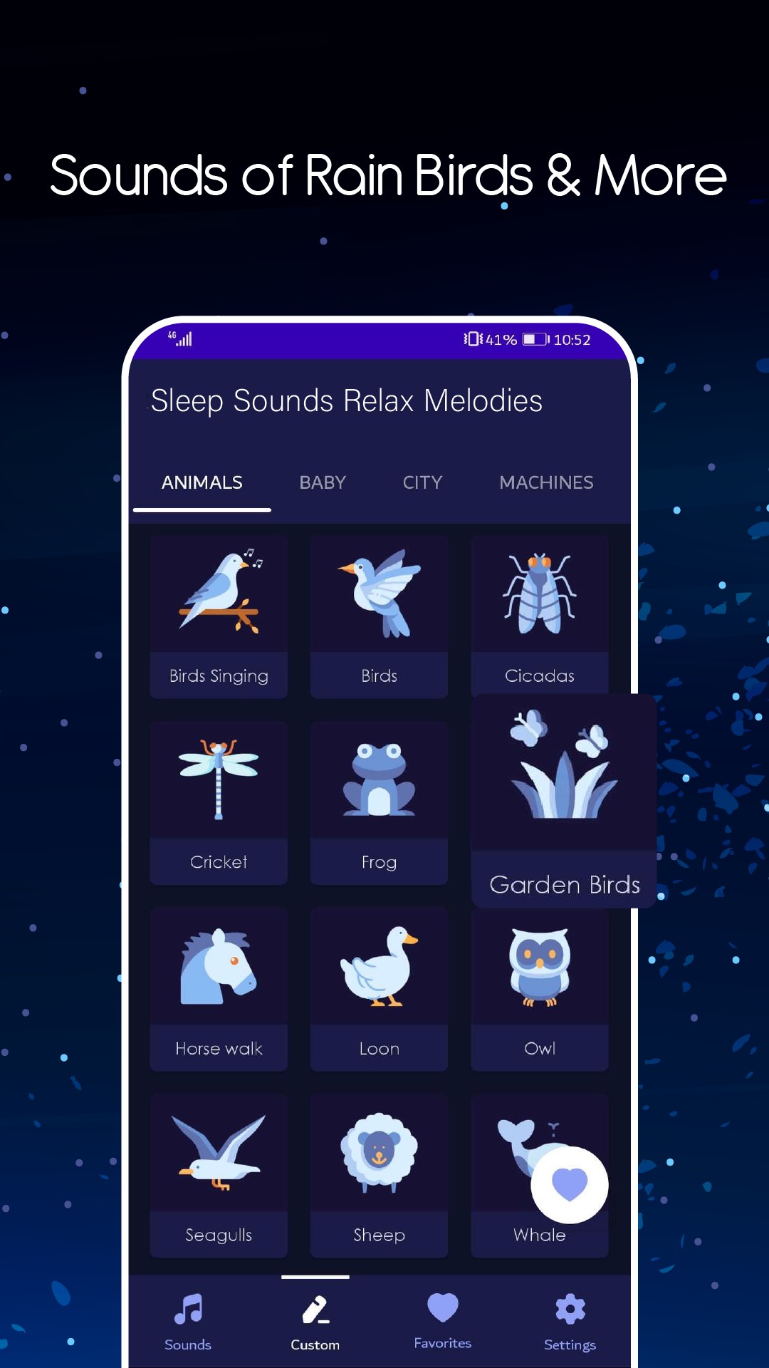 These sounds for sleep are relaxing melodies. Nature sounds including birds sounds, river sounds and wind sounds are specially added for people who love nature. You can use natural sounds with one of the best free sleep apps. You can select melodies like birds singing, sounds of rain, white noise sounds, night sounds, and other free sleep apps sounds.
