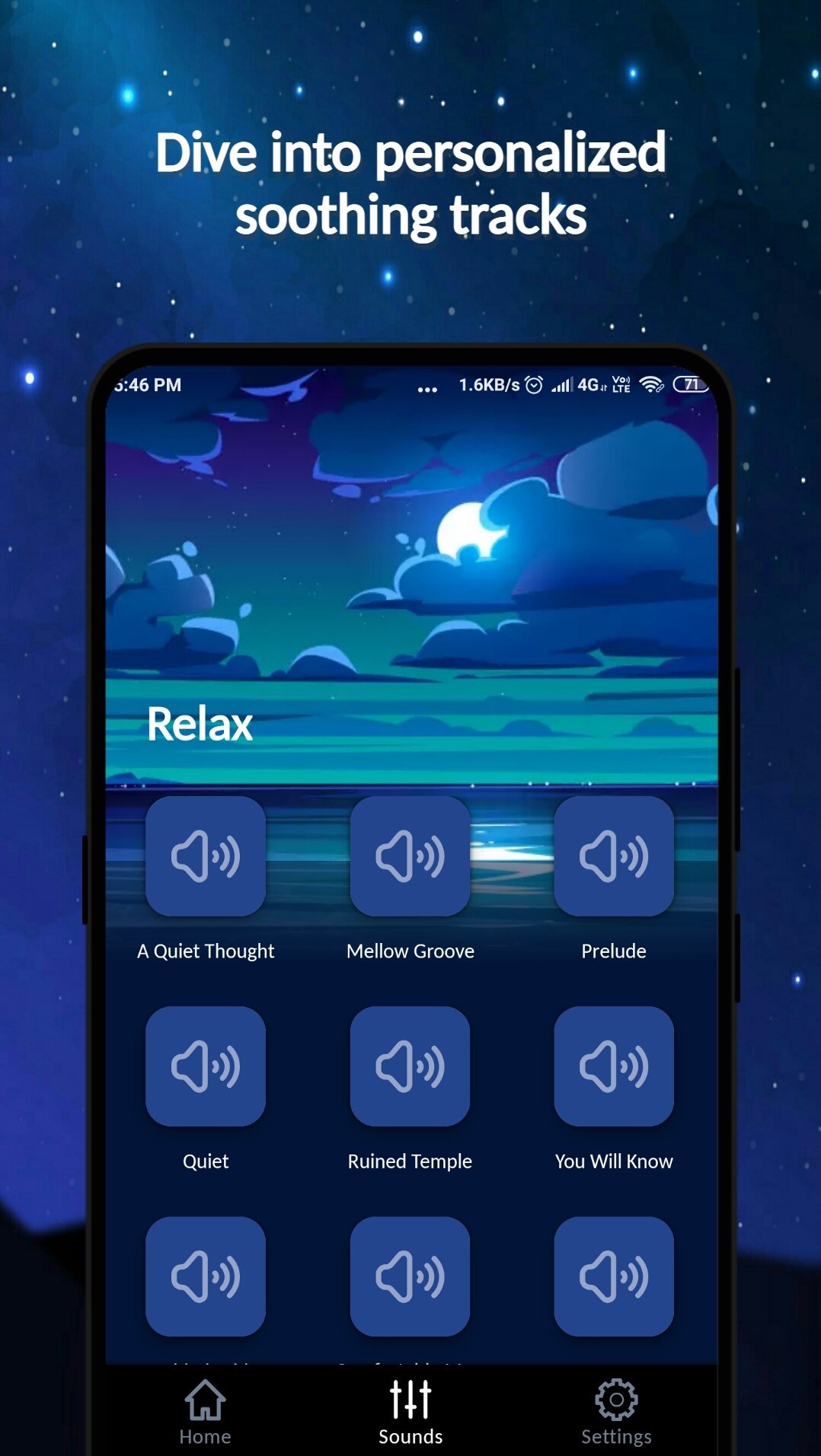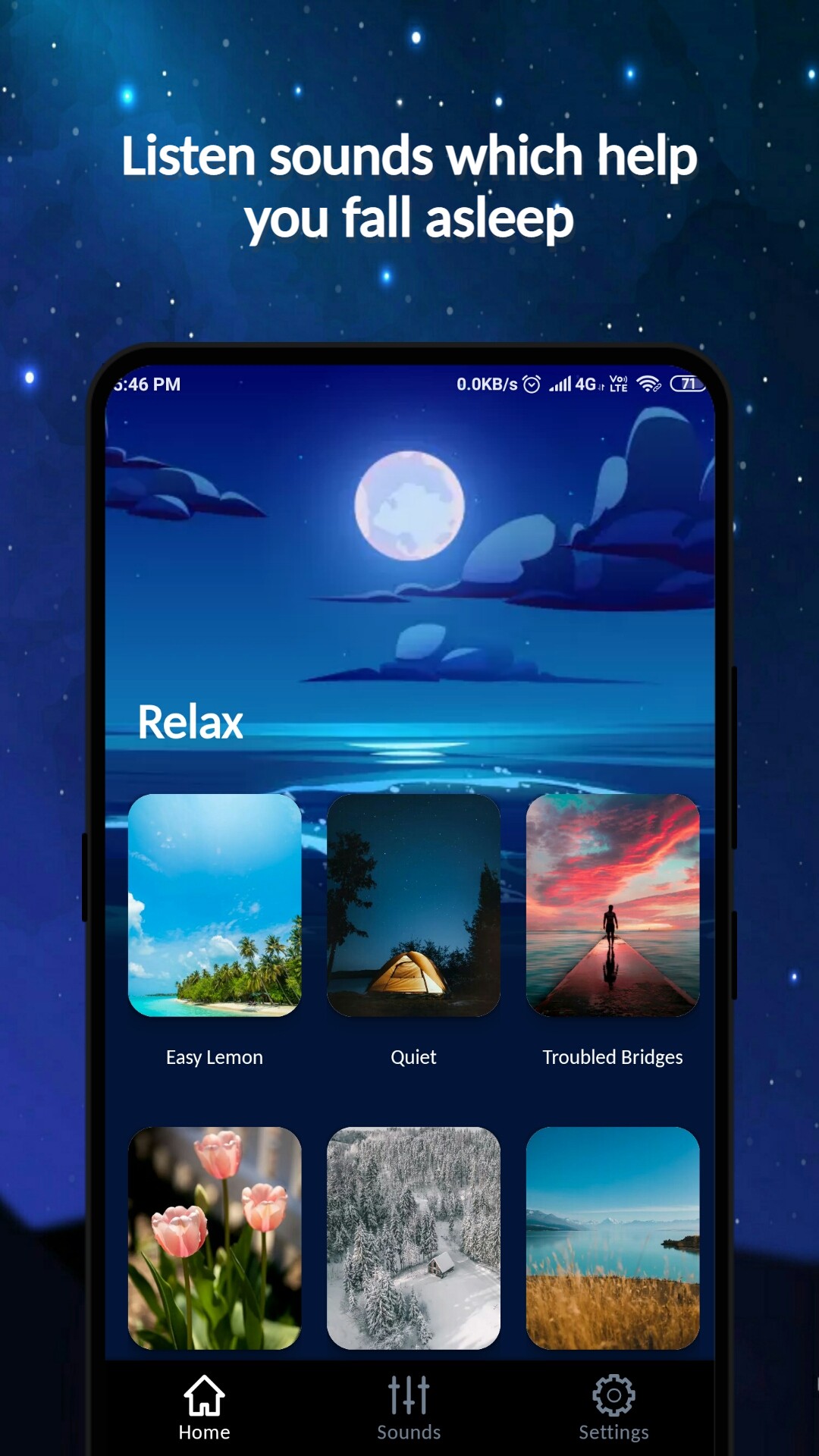 Sleepy provides you a great collection of calming soundscape story sleep that give you the perfect relaxing ambience sound to relax. You can choose from different types of rain sounds, nature sounds, city sounds, sweet sounds, white noise, relax melodies, baby soother and animal sounds.