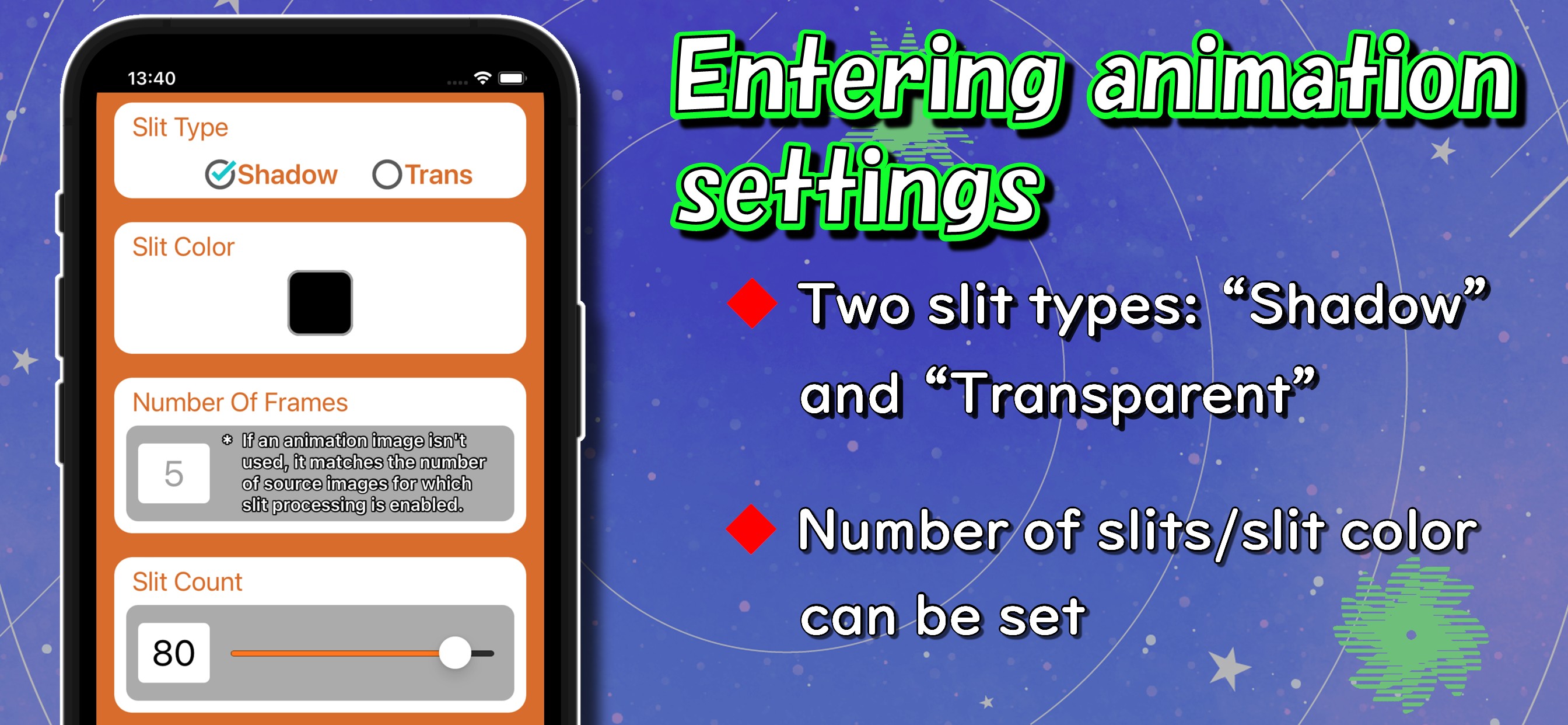You can also create your own slit animation within the app.