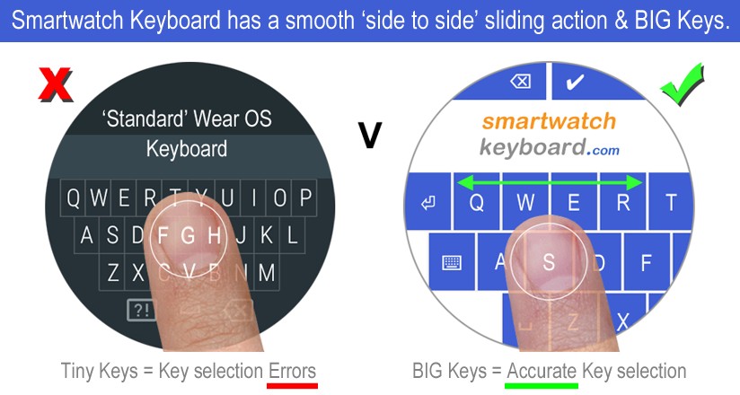 Smartwatch Keyboard for Wear OS slides from Side to Side which enables a much WIDER Keyboard than is normally physically possible on a Smartwatch screen.