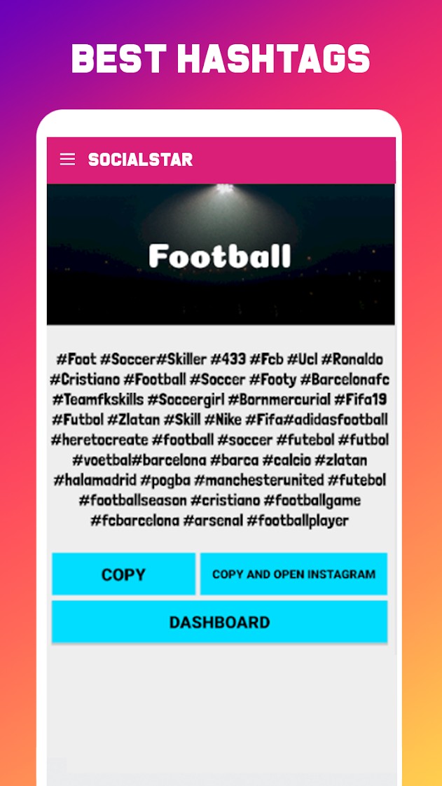 SOCIALSTAR is a tool of hashtags that will help you to grow your social media profile to get more organic likes and followers, with the best hashtags and captions!