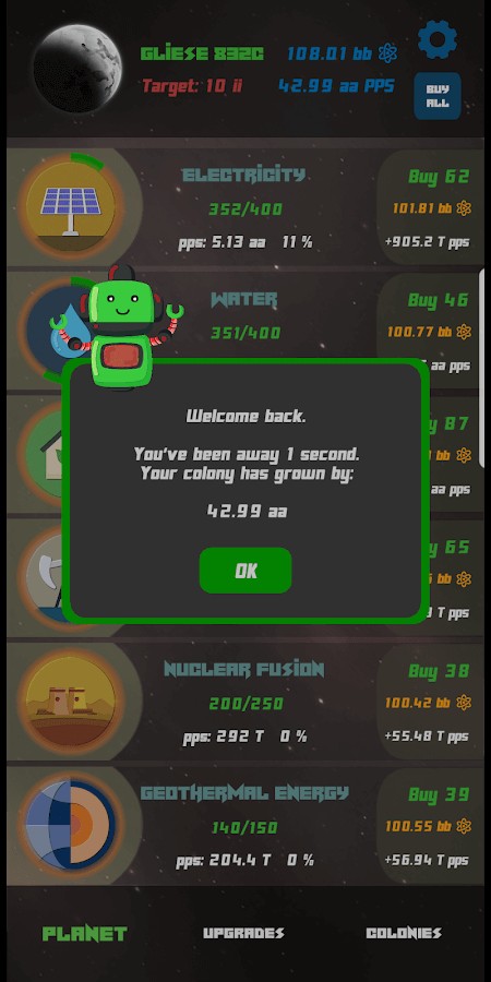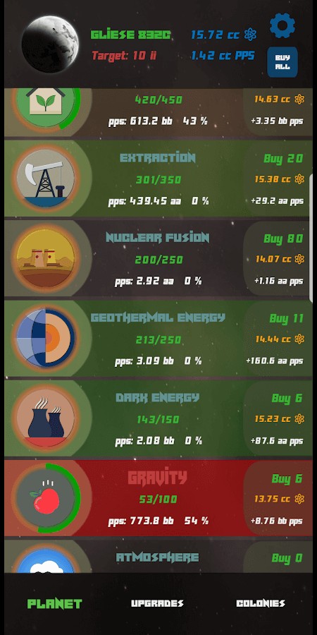 Space Colonies is a Sci-Fi idle clicker which allows you to colonize planets from the whole Universe and later on even from parallel universes. Colonize exo-planets and unlock new technologies and upgrades.