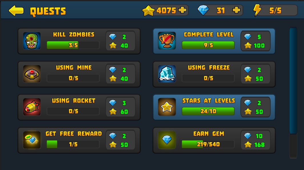 - You will get gem and gold after complete each level, the reward will be increased after each level and you will get more reward if you complete the level with more star.