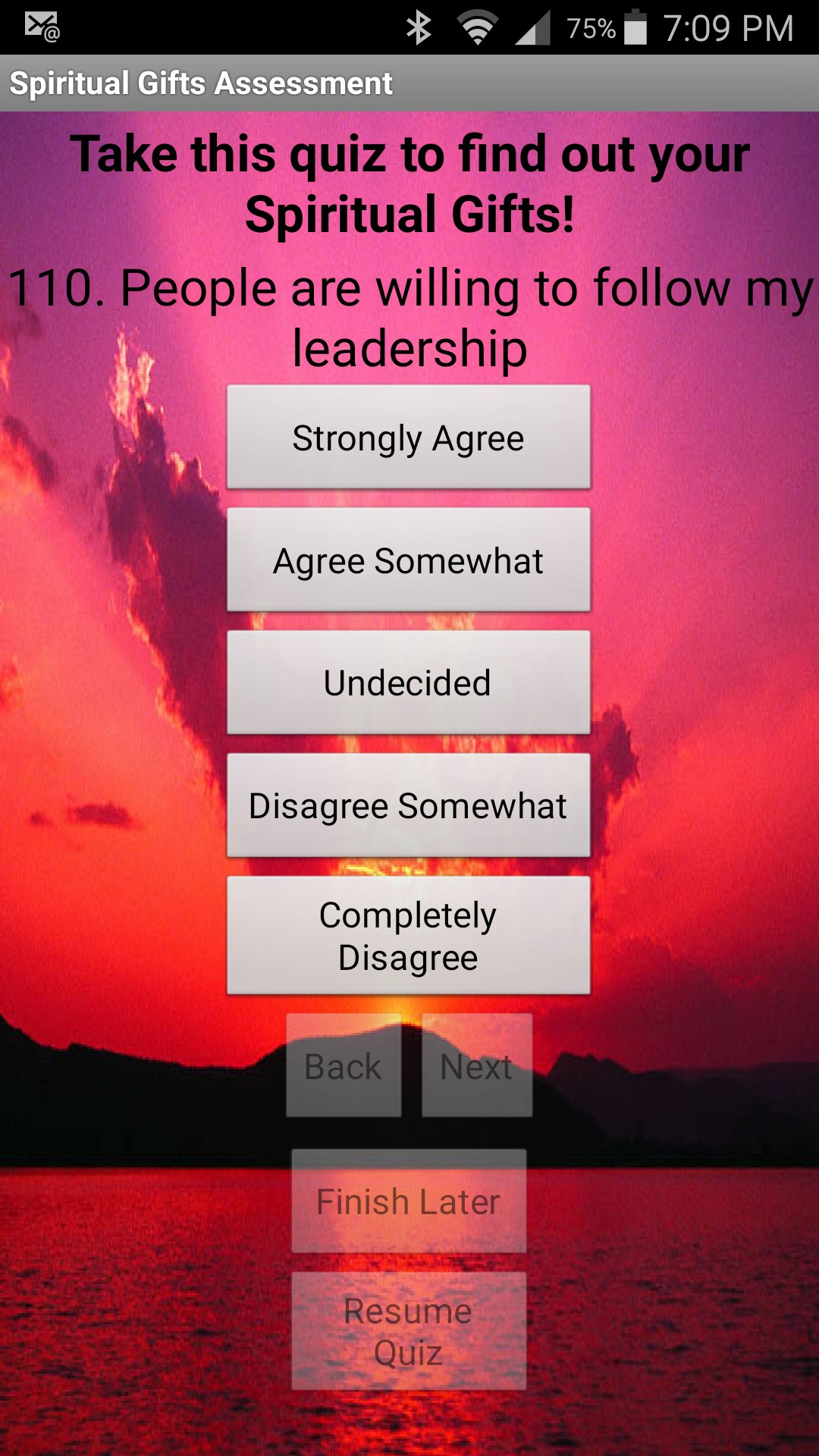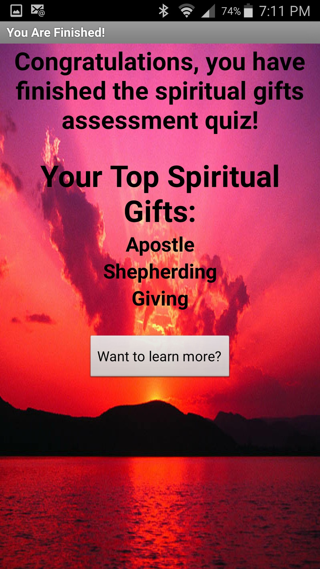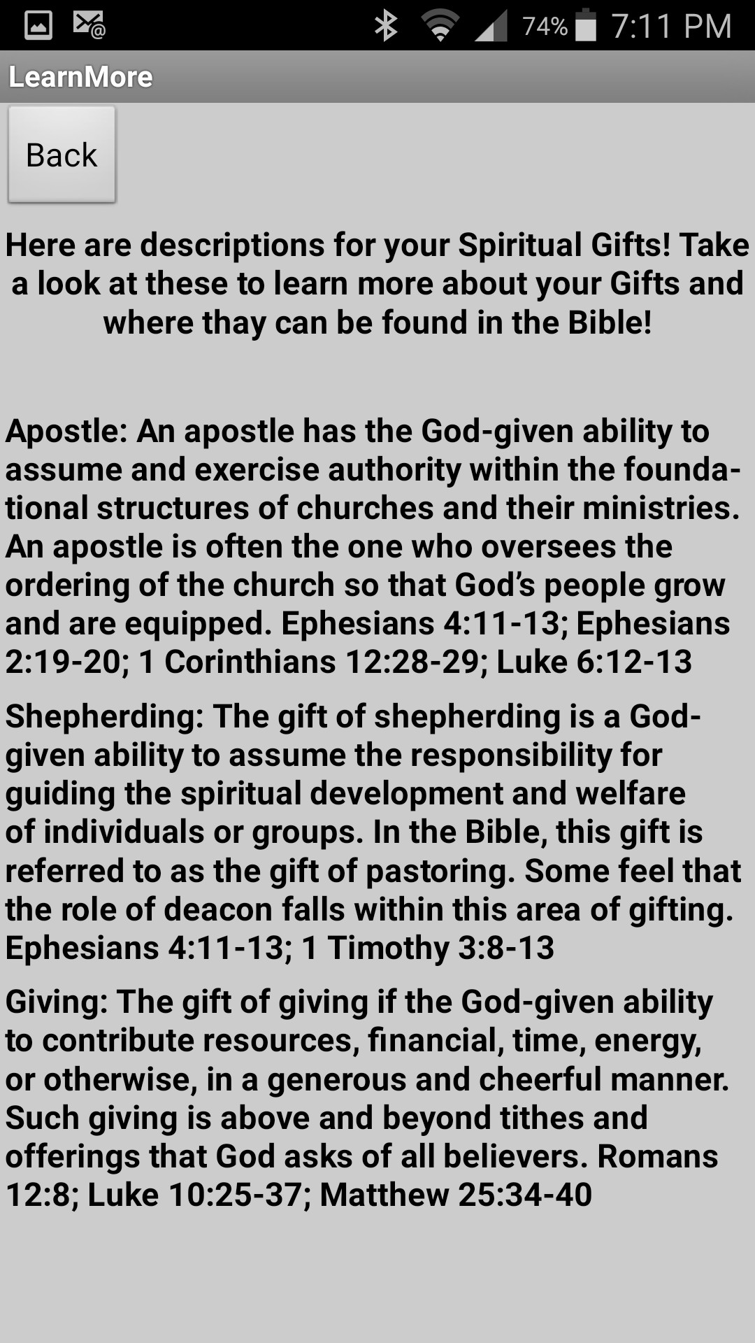 Welcome to the Spiritual Gifts Assessment App! This app will help you find out your Spiritual Gifts! The Quiz is not timed so take your time and think through all the questions before you decide.Good luck with your Spiritual Gifts!