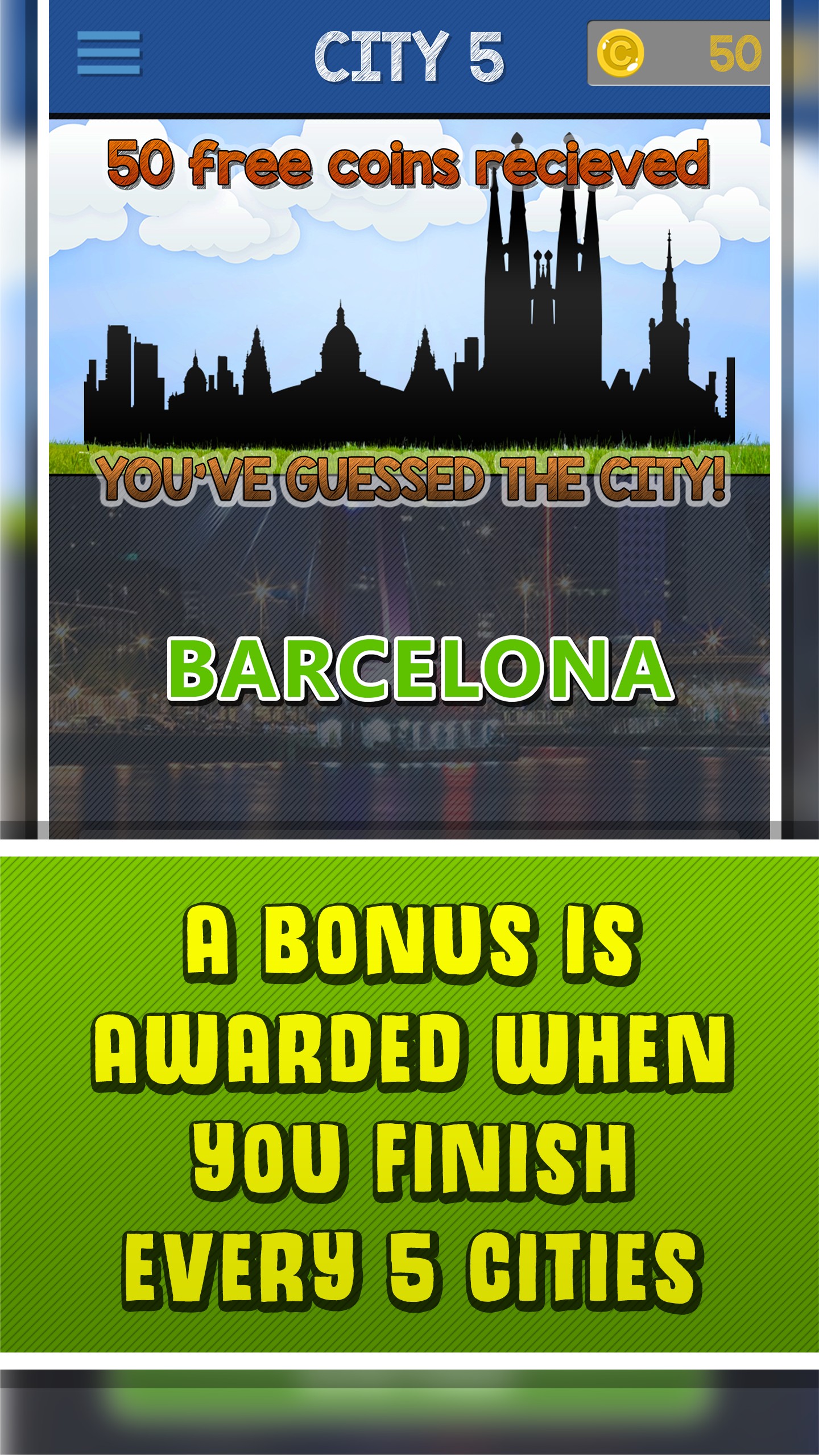 - A bonus is awarded when you finish every 5 cities