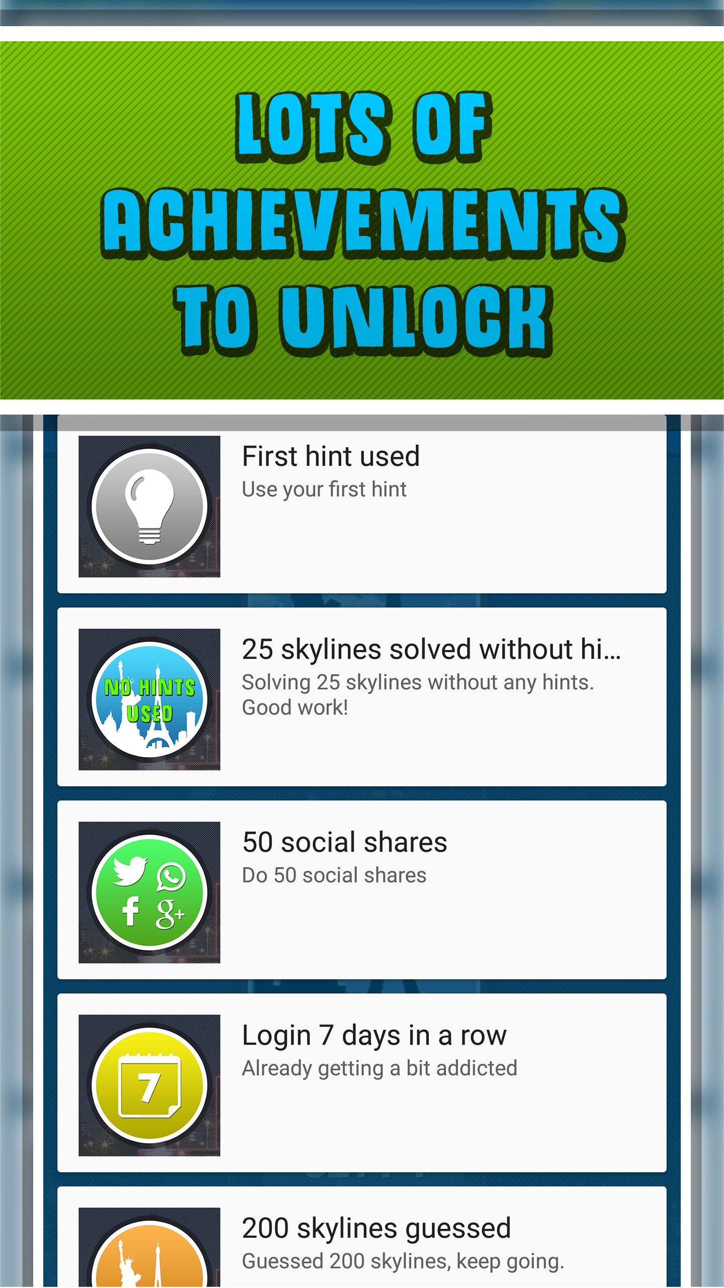 Track your progress by unlocking the in-game achievements! The more cities you guess the more achievements you can unlock. Try to collect them all.