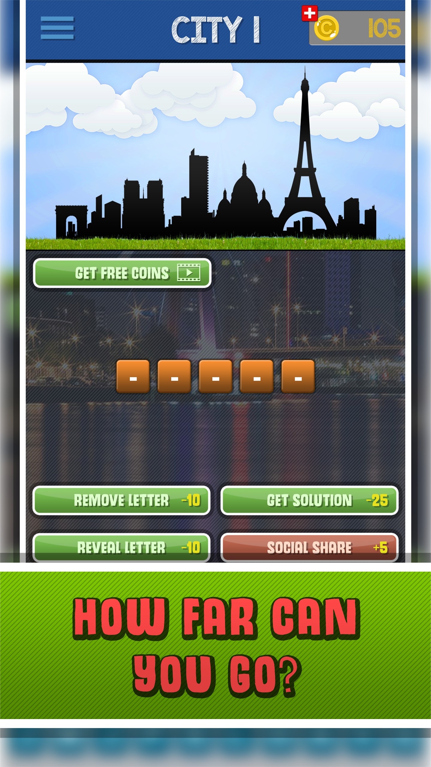 Stuck on a city skyline? No worries, you can always get hints with your available coins or ask your friends on social media!