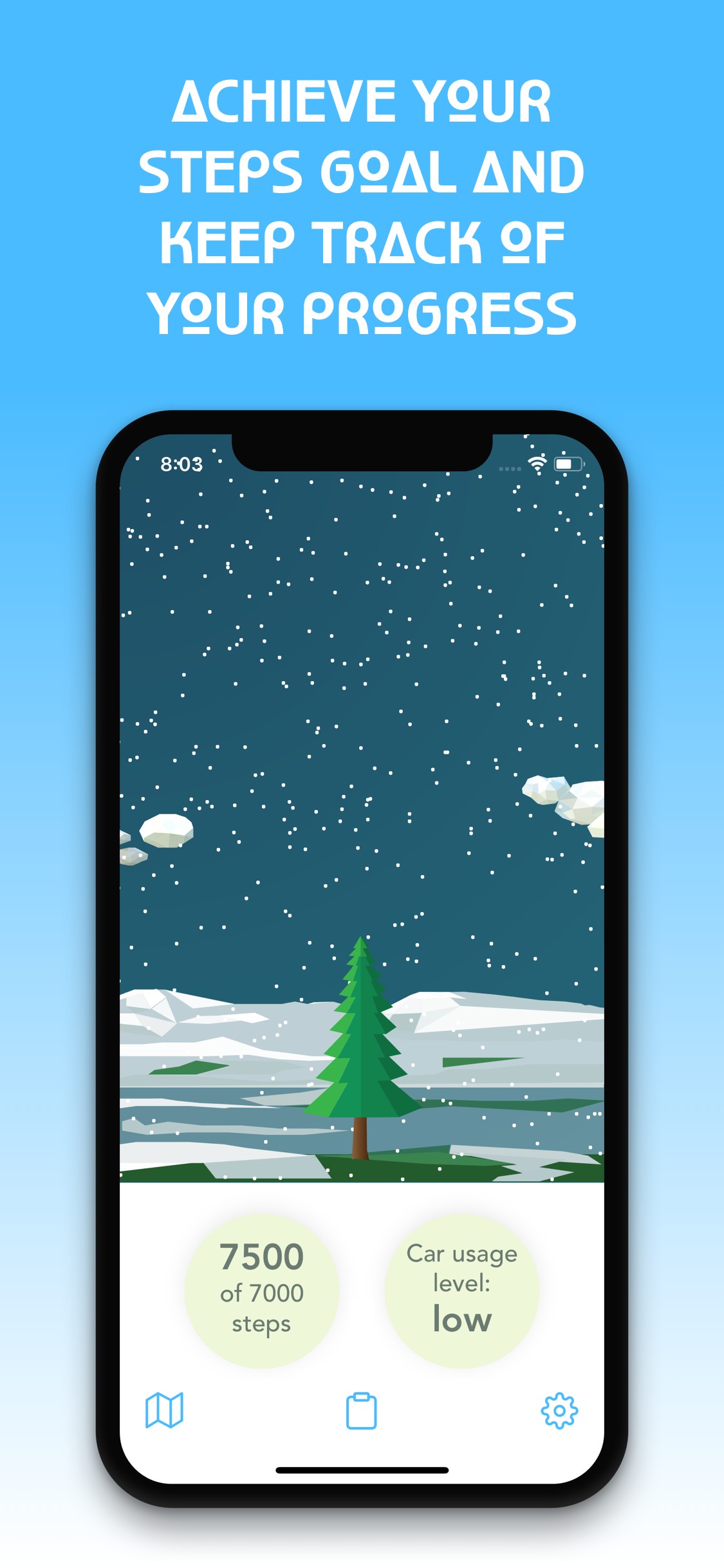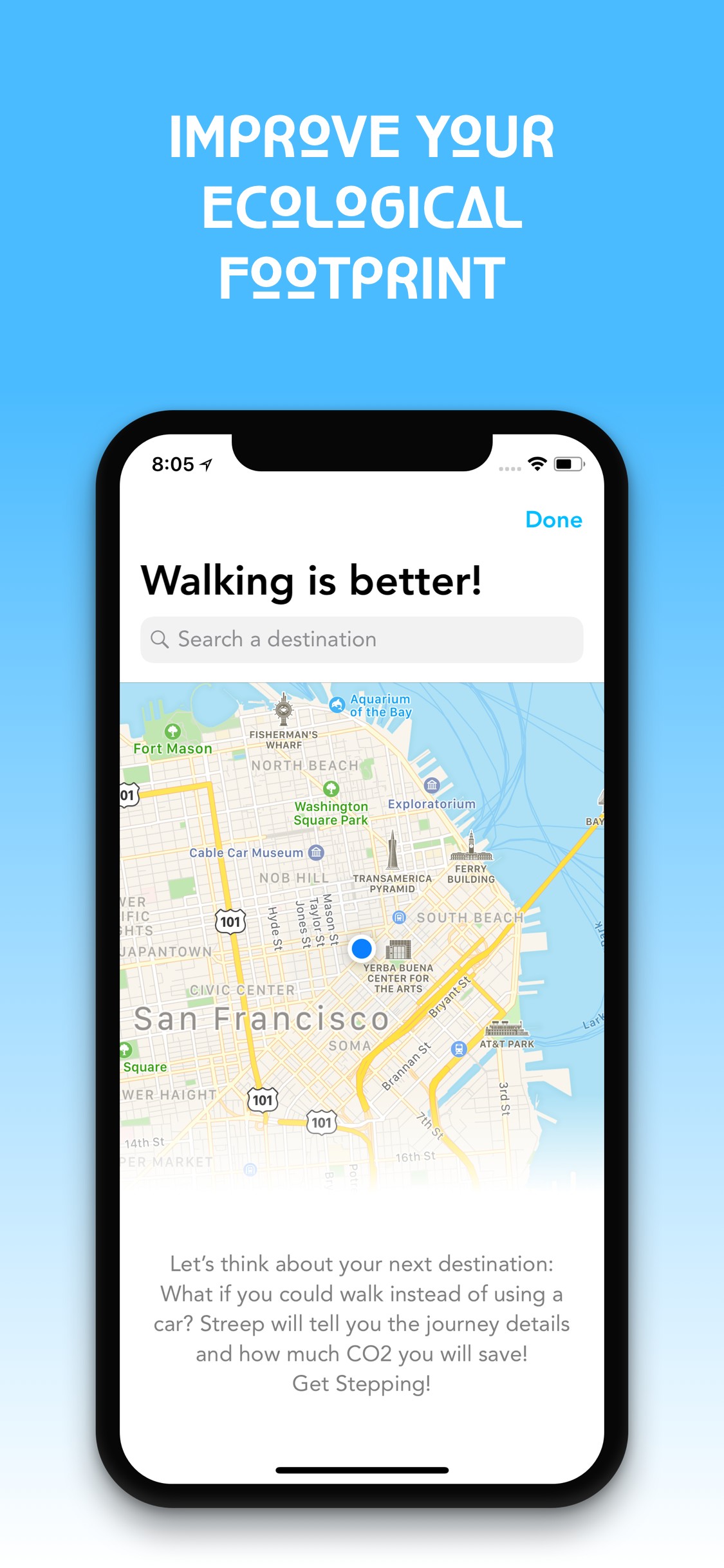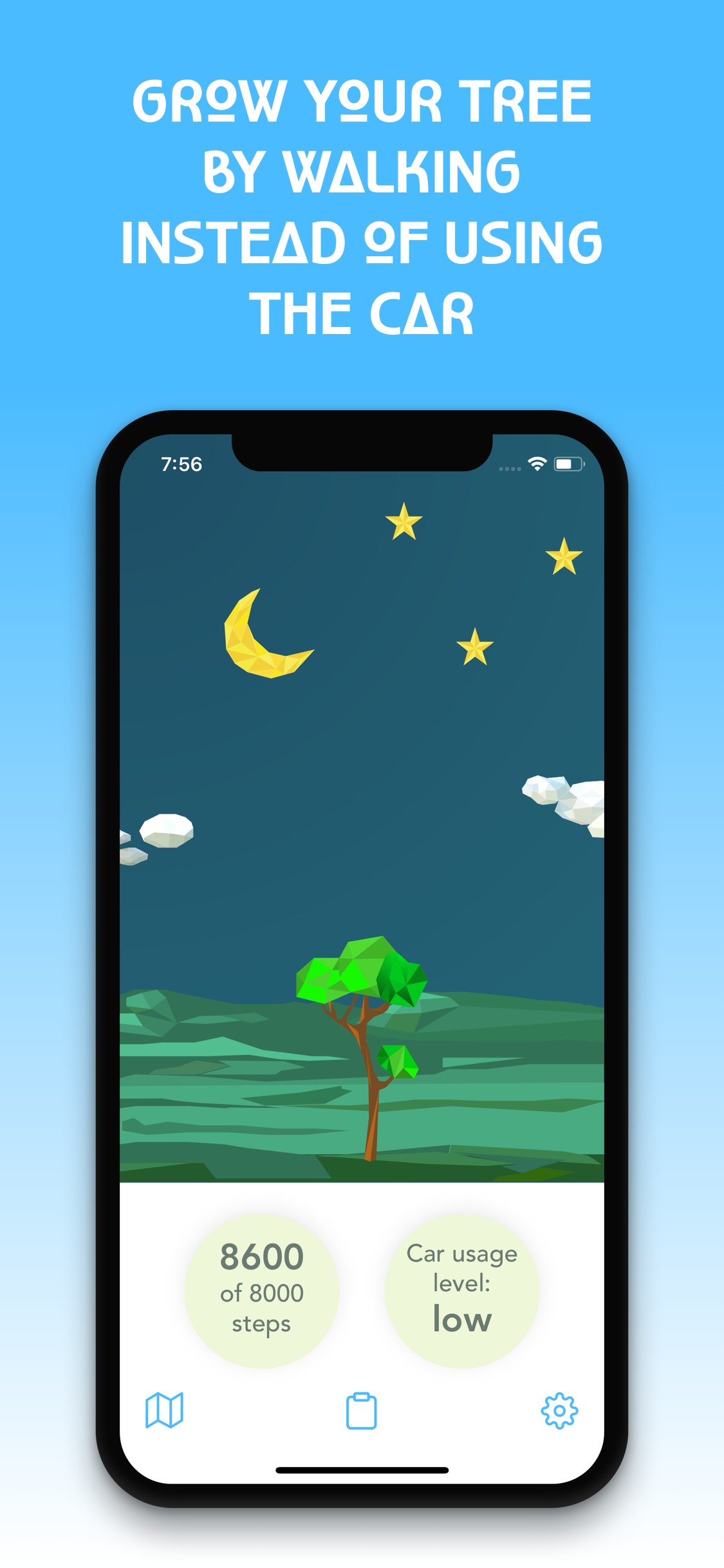Climate change effects all, and we can all do something. Streep is here to make a difference by analyzing one of the main things we do everyday: move. Your daily challenge is growing your own tree. The more you walk, the more it will grow; but the growth of your tree will decrease depending on your daily car usage. Streep will motivate you to have a better ecological footprint during the day: when you will achieve a good balance between steps and car usage, your daily personal tree will complete his growth. The app is integrated with the Health app to know how many steps you're doing during the day.