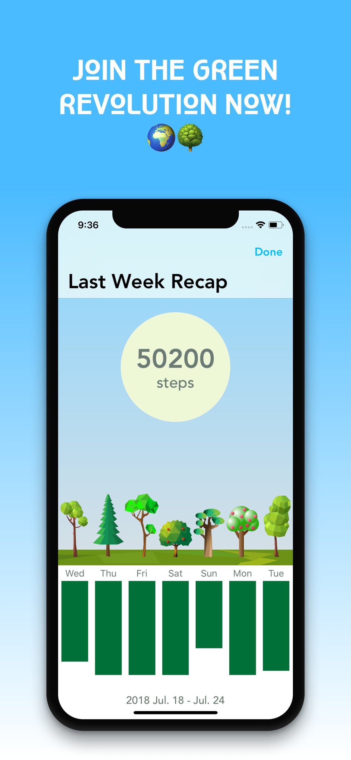 Check the growth of your tree based on your daily steps goal and car usage; the tree will grow up in a scenery with real-time weather and air pollution conditions.