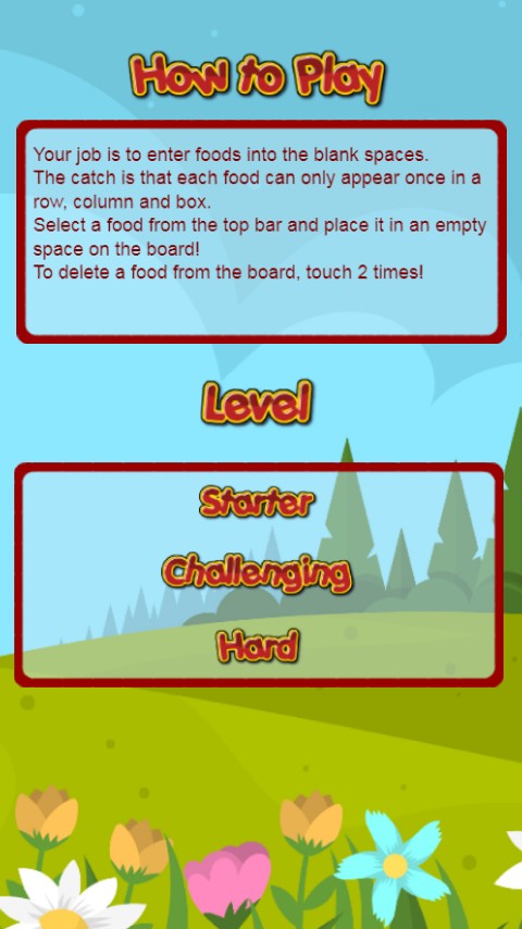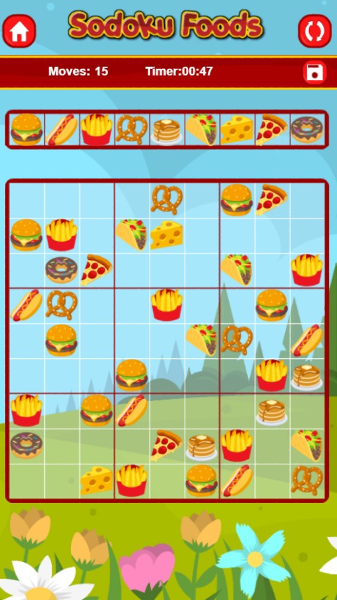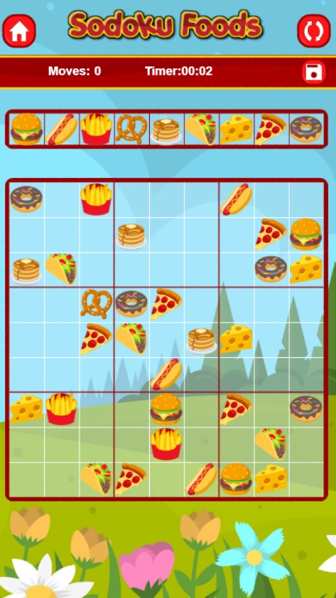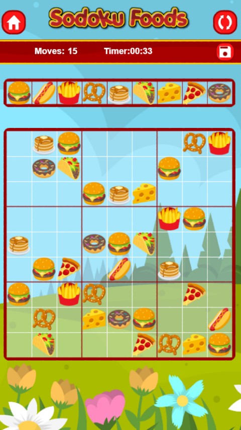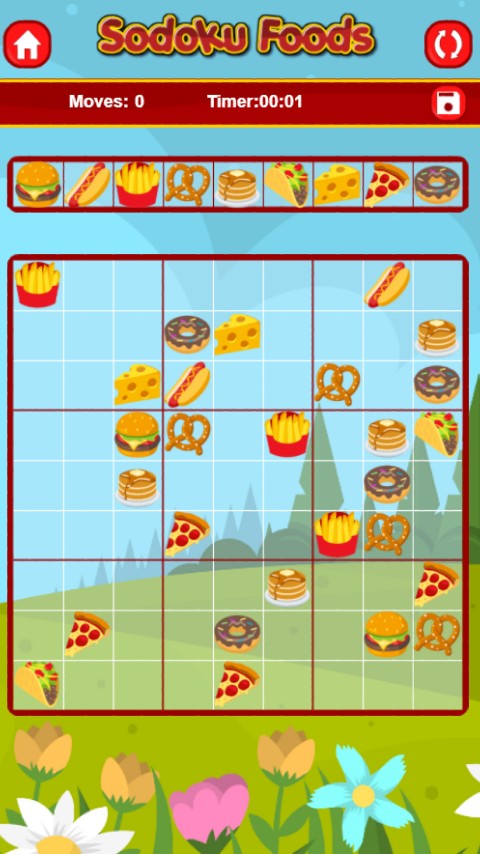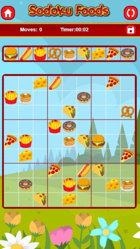 The rules of the game are the same, you need to complete the board by putting the food without repeating it in the row, column or box!