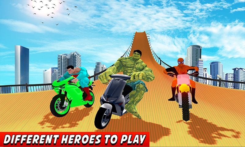 Welcome to the Superhero Bike Impossible Ramps City Stunts where superheroes become best sports bike driver and perform stunts on different mega ramps as well as in the city. All superheroes like super hero, spider hero and monster hero are set for super bike racing challenge in the ramps city stunts. It’s time to fulfill your dream of playing as a new superhero bike stunts and beat your rival time during driving. Choose your different super bikes as well as Superhero and perform the stunts by playing impossible ramps stunts challenge.