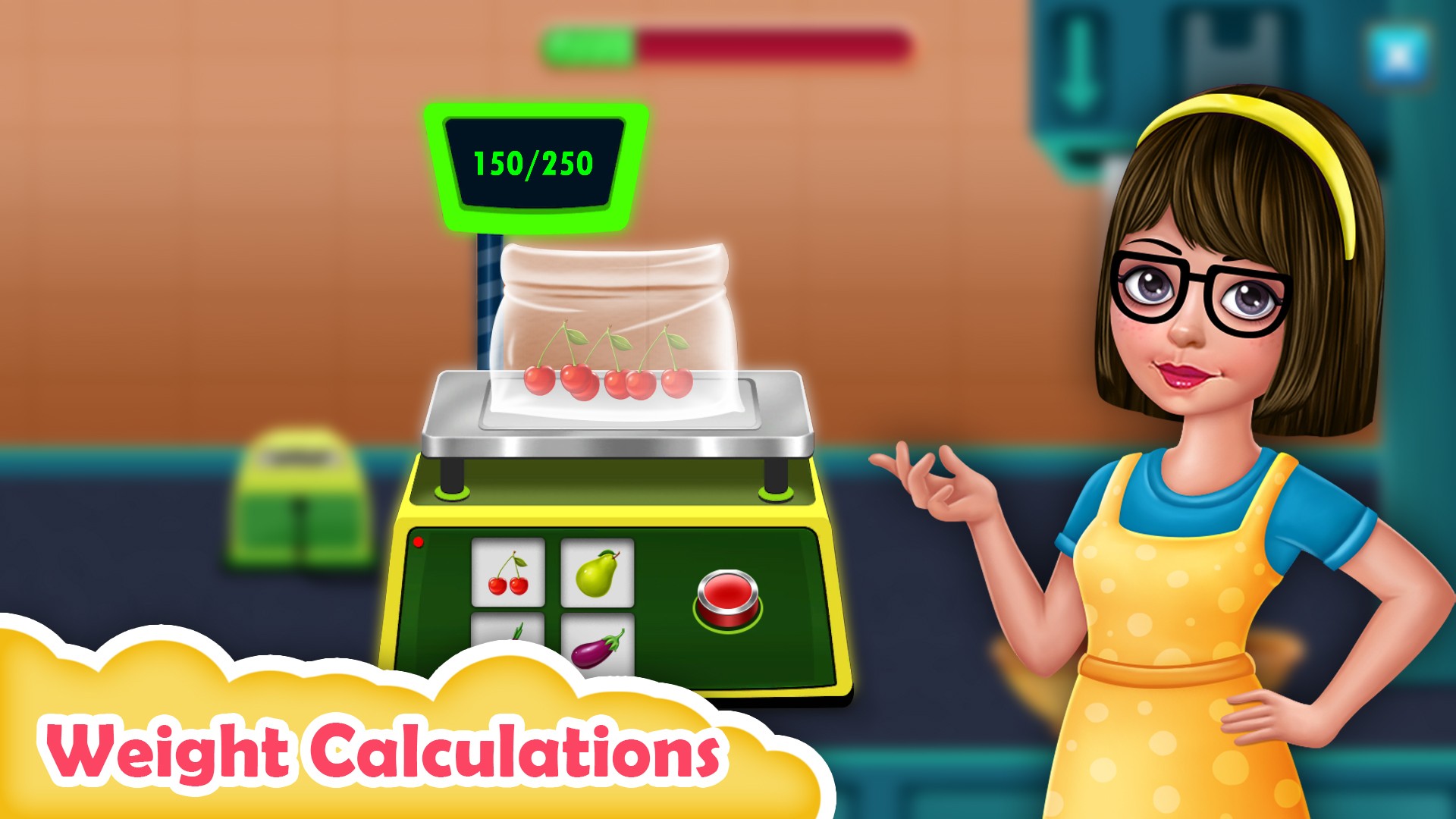 Weighing machine: Simply grab a bag and pack fruits and vegetables in it. To avoid the red number on the scale put the right quantity on the scale and weigh it. Play as a cashier in a realistic supermarket cashier game for kids.