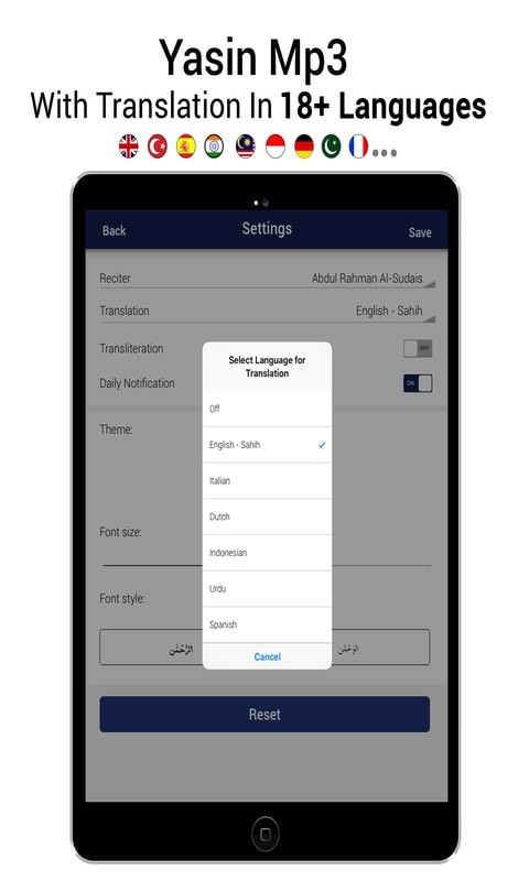 • Translation of entire verses of Surah in almost all languages including English, Hindi, Bengali, Spanish, Persian, Dutch, Chinese and Malay