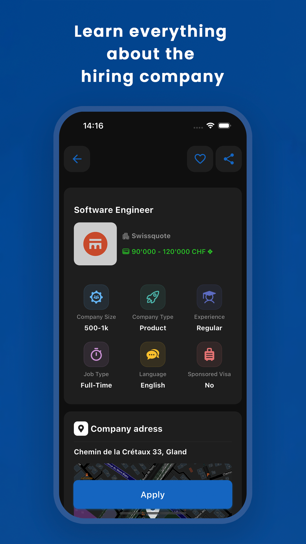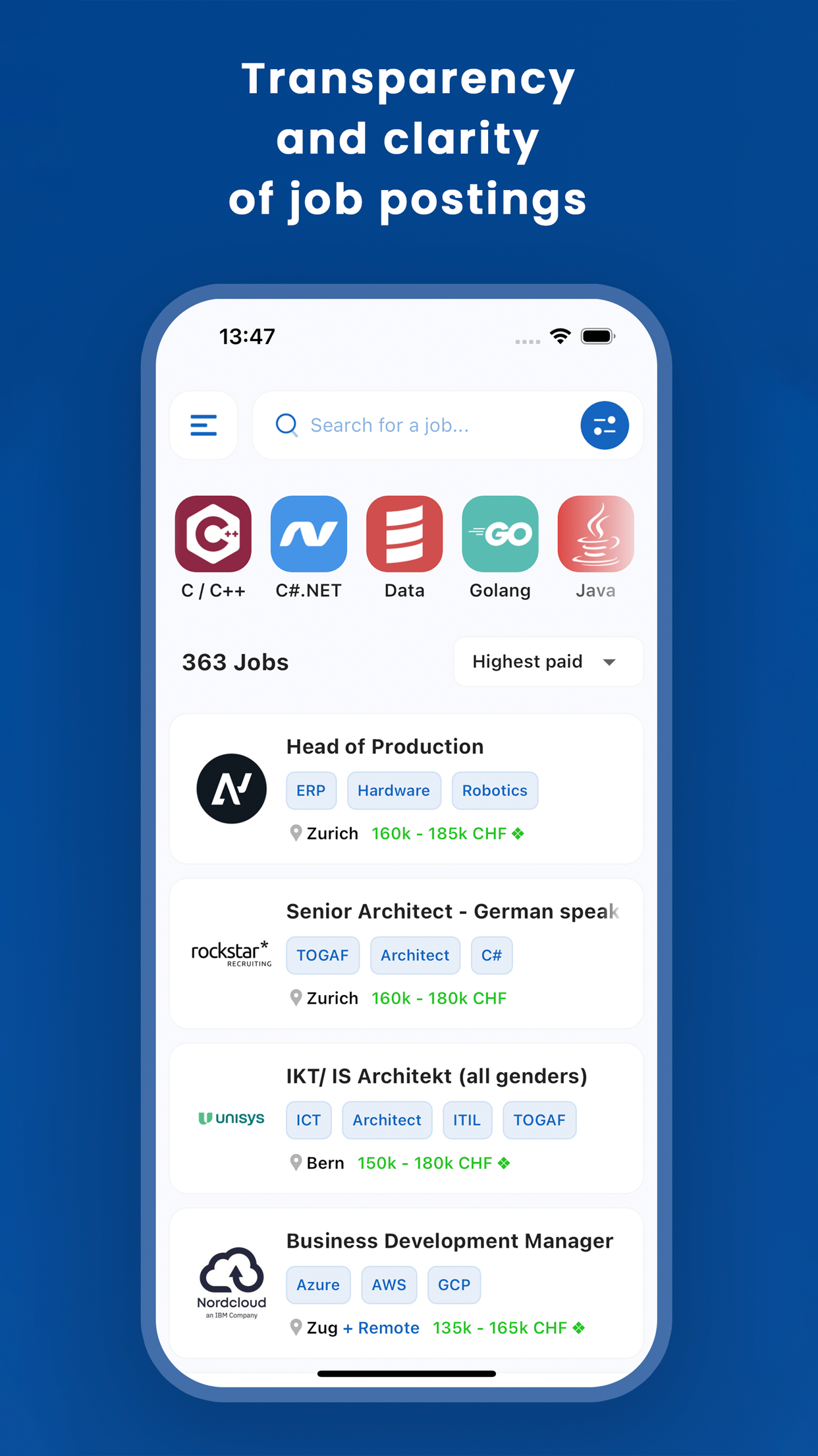 Explore IT and Software Developer jobs in Switzerland, complete with salaries and detailed tech stacks. Get to know the companies and apply directly through the app.