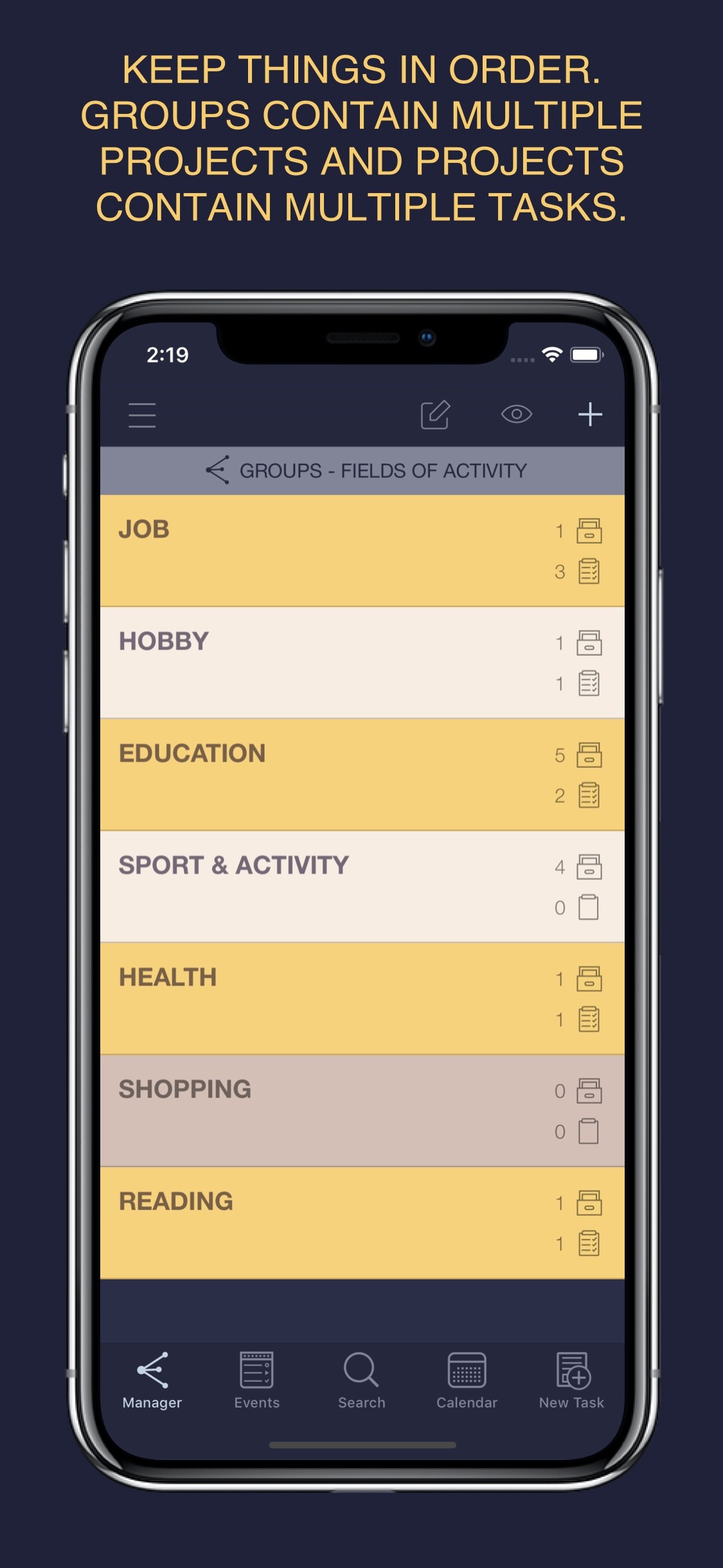• The app has Group > Projects > Tasks > Events hierarchy. Tasks are located inside Projects. Projects are located inside Groups. The task can have multiple events.