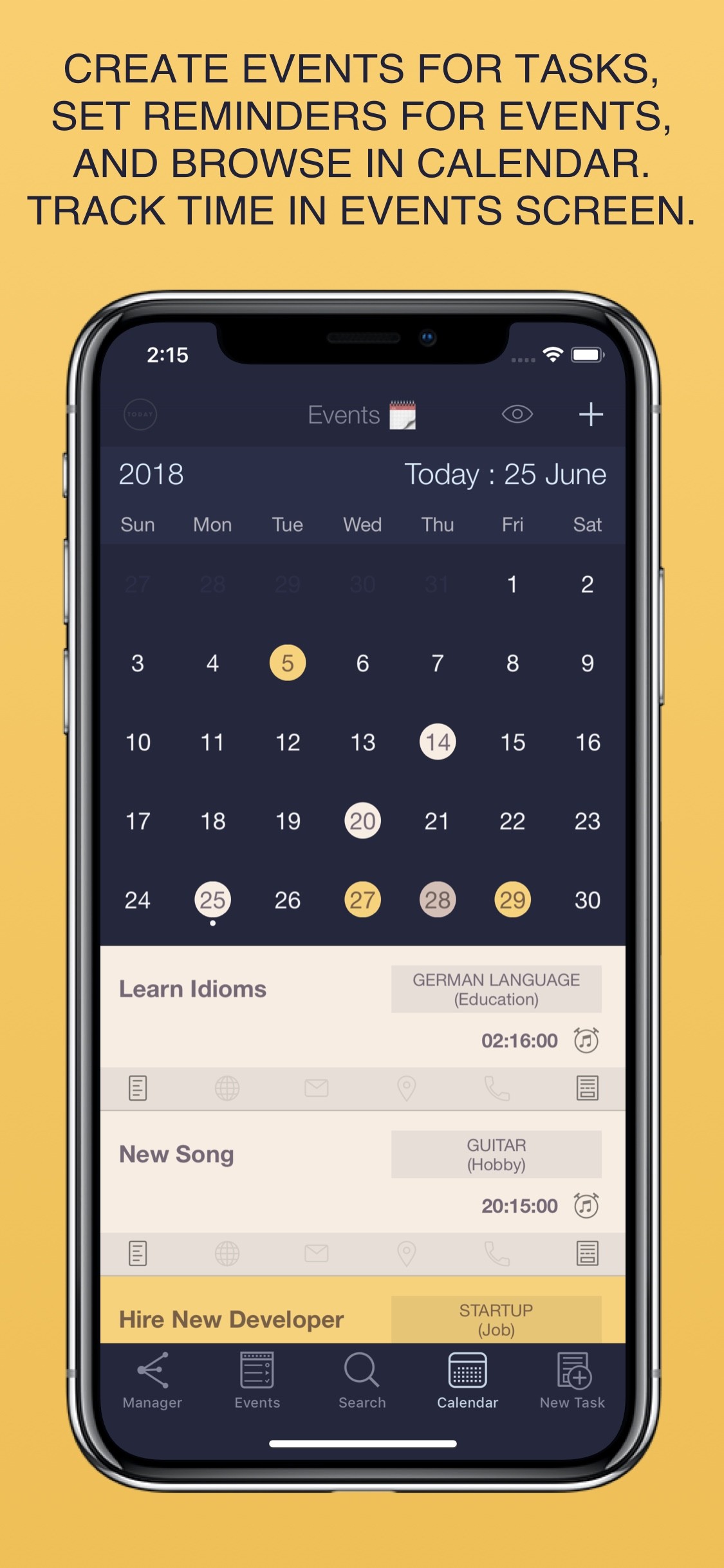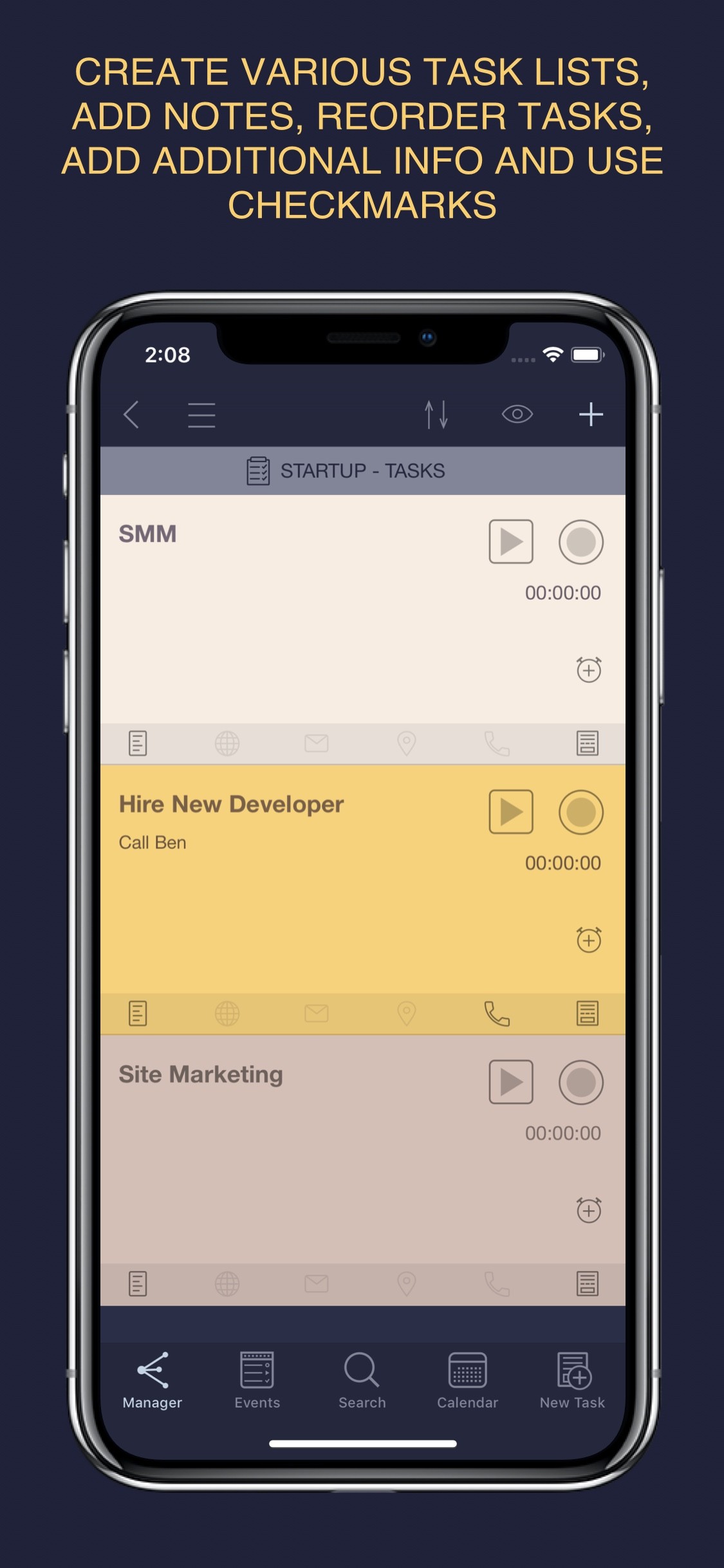 When you create a new event, you can run/stop it and check/uncheck it’s completed state in one tap on the Events screen. You can track the time spent on every event and task.