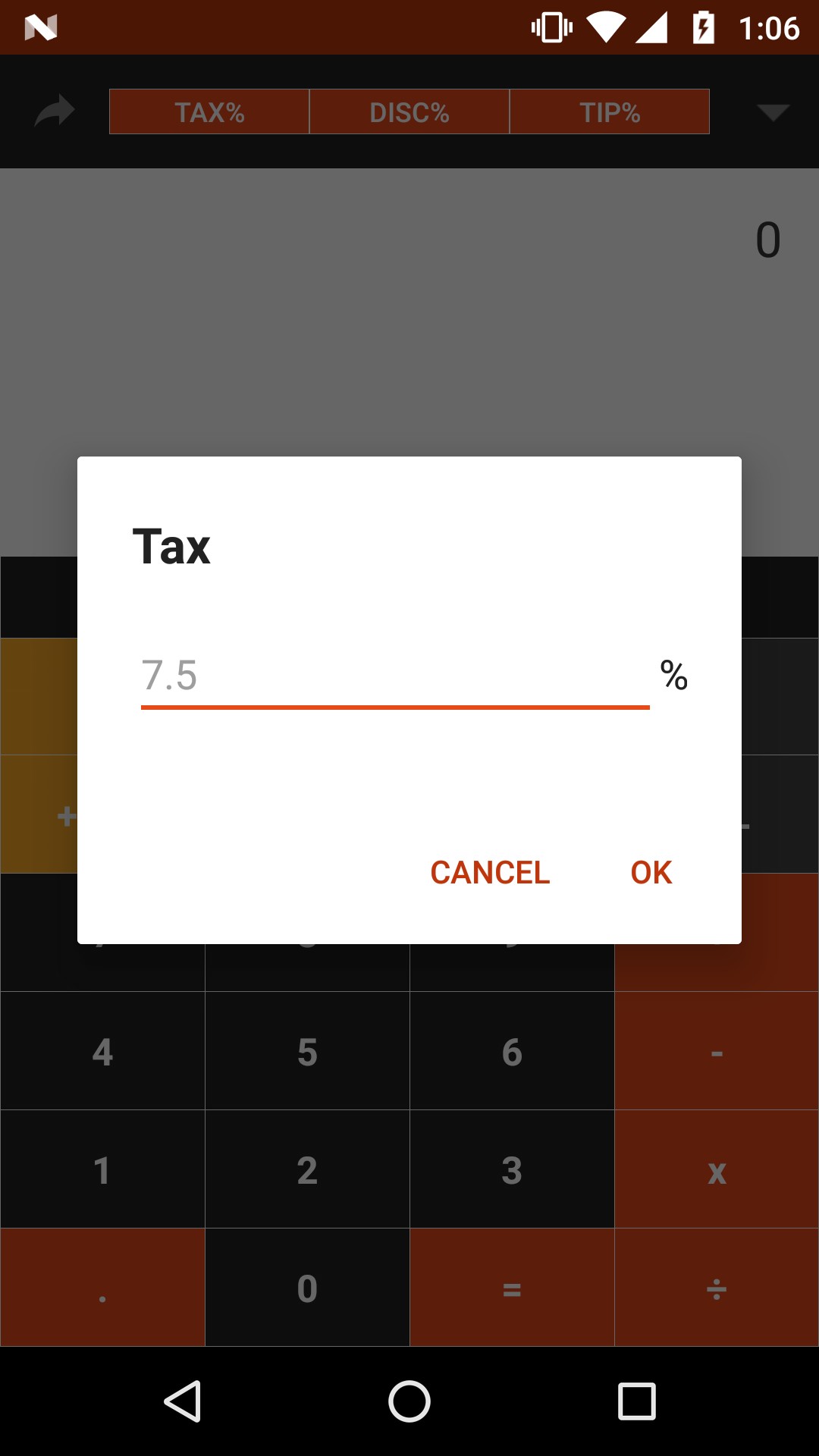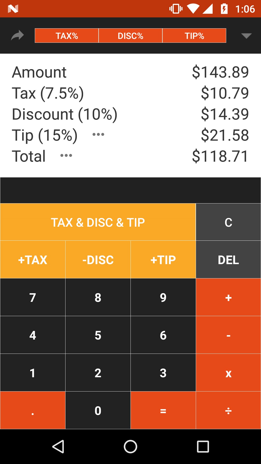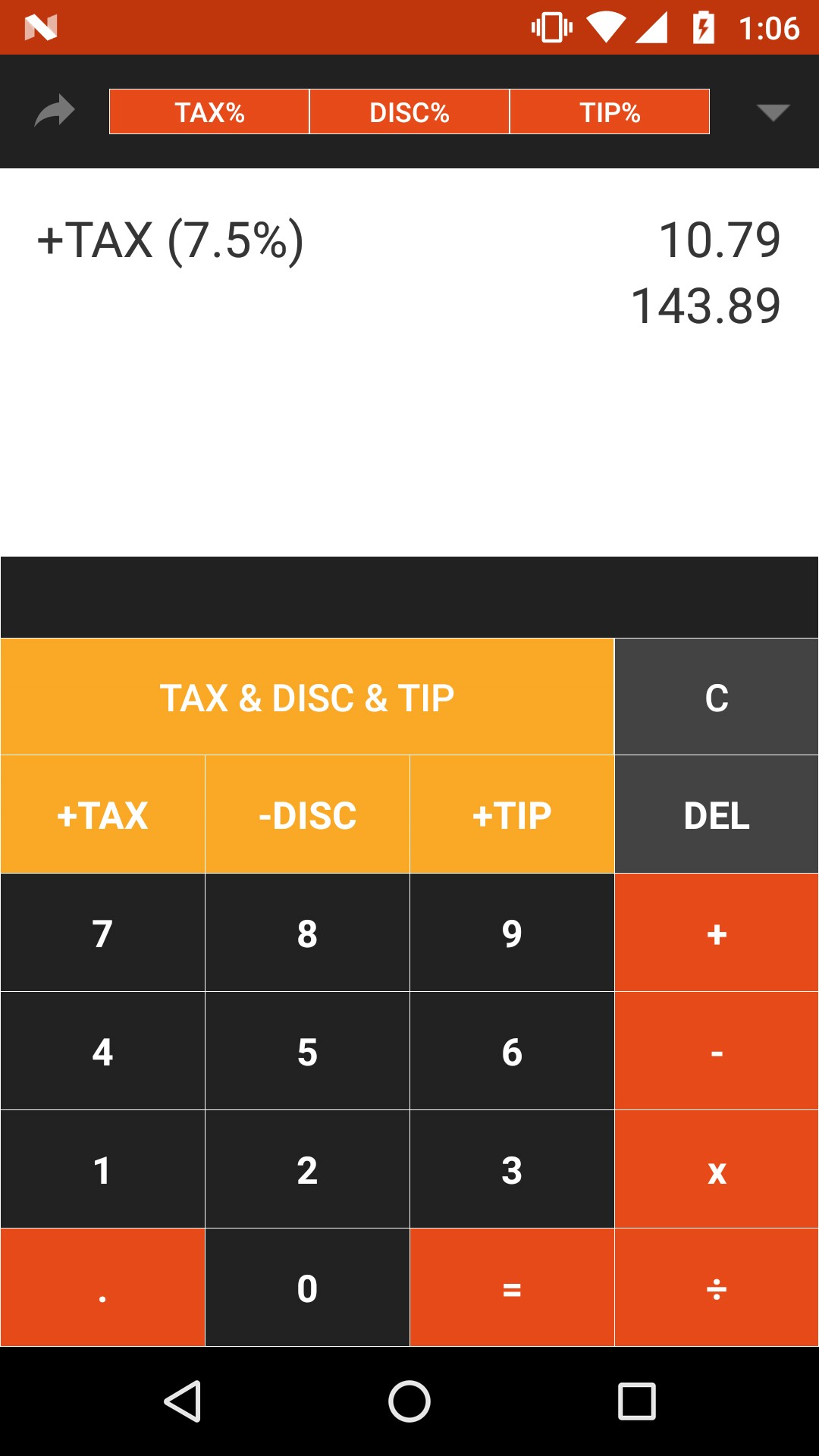 Features: - Calculates sales tax, discount, tip and total - Share results (via SMS, Whatsapp, email ... etc)