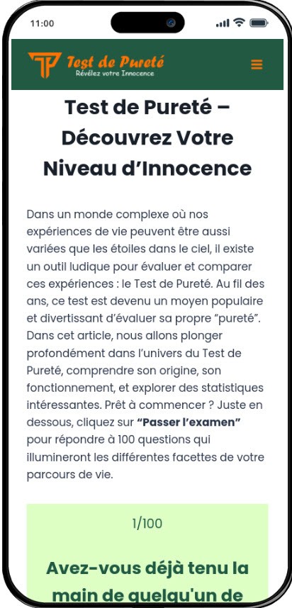 Welcome to our site dedicated to the Purity Test (https://xn--test-de-puret-nhb.fr/), a fun tool allowing you to evaluate and compare your life experiences. Originating from Rice University in the United States, the Purity Test has grown in popularity over the years, becoming an entertaining way to explore your level of innocence.