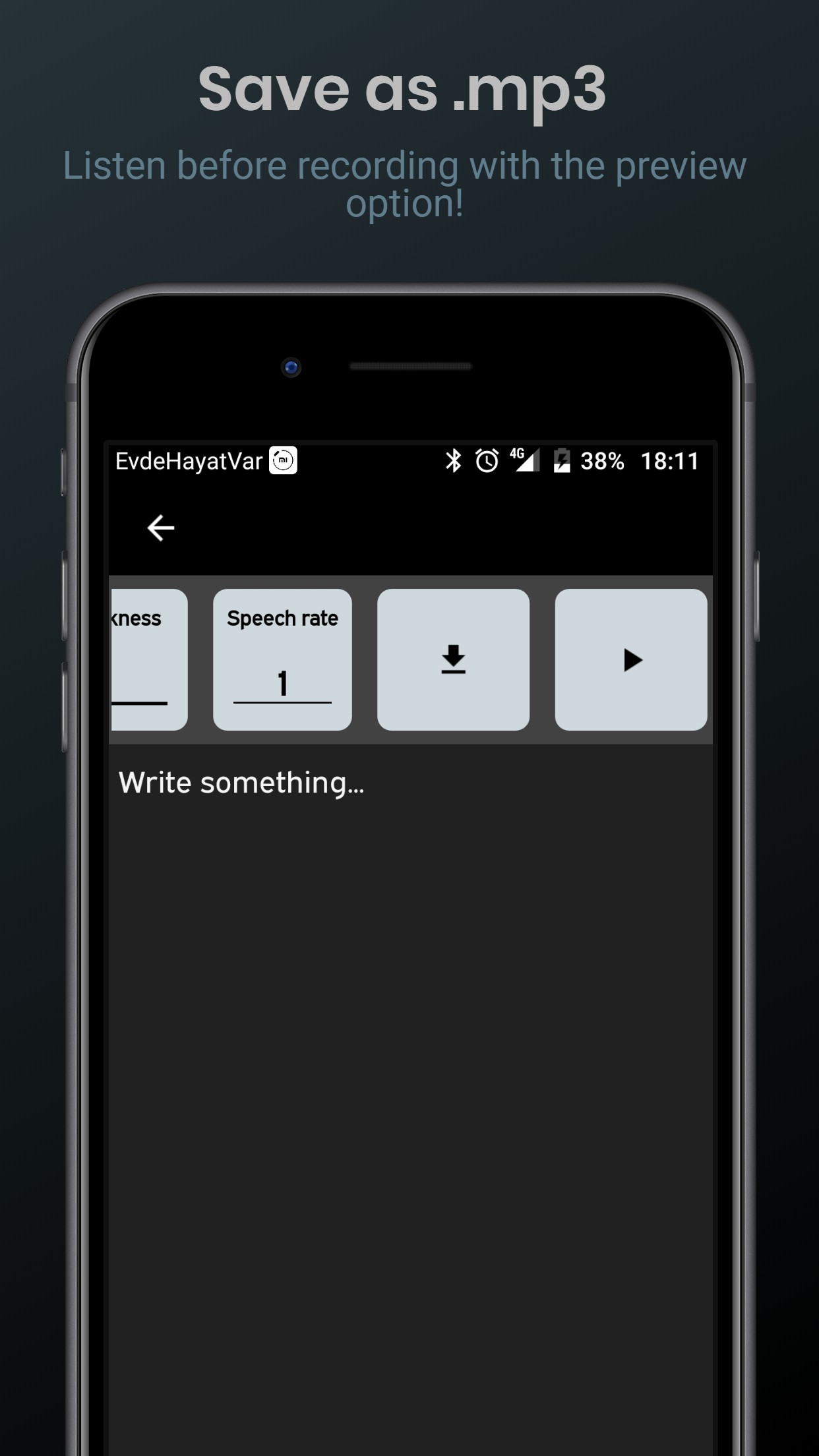 If you want to convert the text into speech, first choose the sound that suits you best from the accent download section. Click the language you want in the main menu. Type the text you want to convert text into sound. From the features not available in this type of tts application, enter the sound thickness and sound velocity sections. Press the Download button. Enter the file name you want (no need to type mp3 at the end, tts application is automatic). And finally press "Save". Translating text into sound is that simple. Recorded mp3 files are stored in your device's files in the text to speech pro folder. It's that simple to use the best text to speech app.
