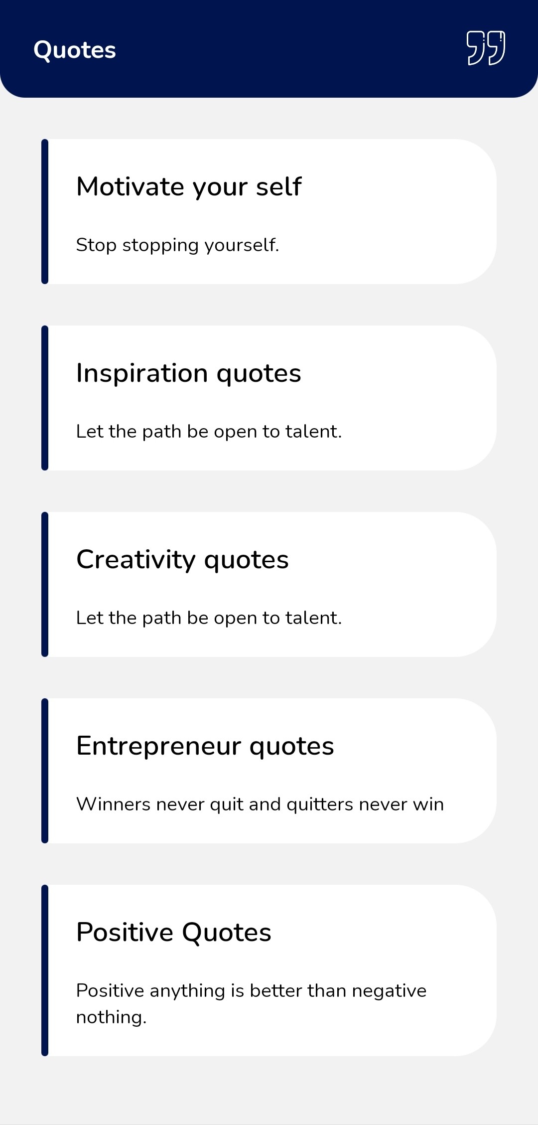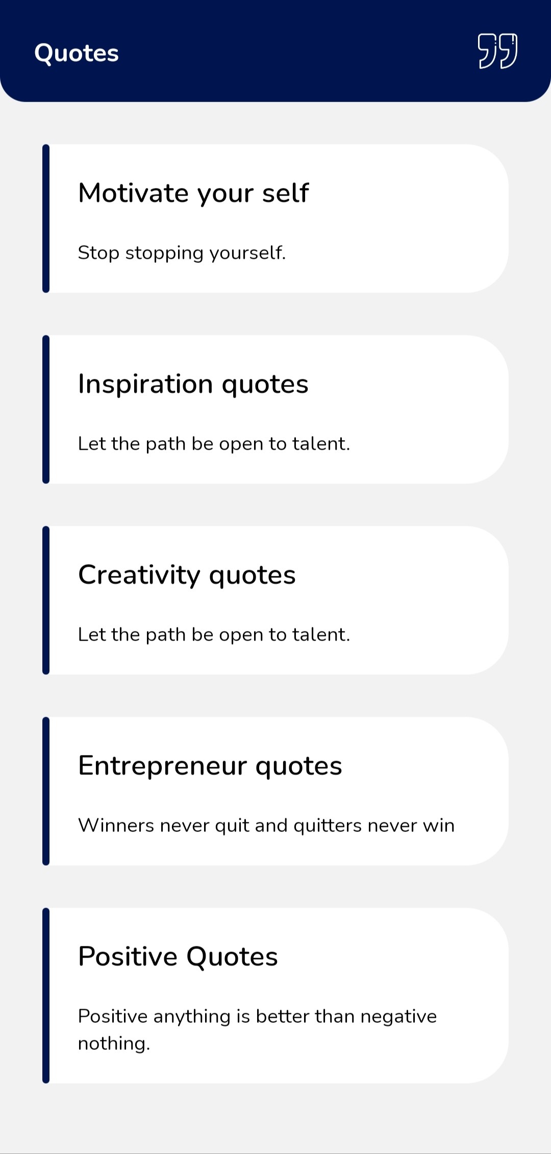 Each quote represents a brook of inspiration, a river of knowledge, and an ocean of motivation. Motivational & Inspirational Quotes is one of the most sought after application that is on a high mission to share a series of knowledge with the whole world. By making use of these Motivational & Inspirational Quotes, you can find awesome quotes that are Flourishing, Awakening, Persevering, Kindling and Uplifting you in myriads of ways. Rest assured, these Motivational & Inspirational Quotes can easily liven your mood and enlighten you up. In short – A simple design, easy to use and the quotes that uplift you.