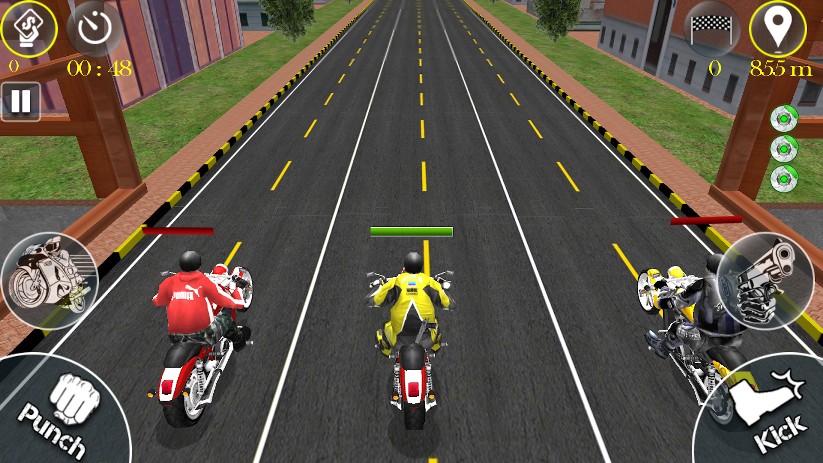 Choose your motorbike, select a game mode and start racing against other riders. Kick and punch them, shoot at other vehicles and do whatever you have to in order to finish the race first and accomplish your objectives.