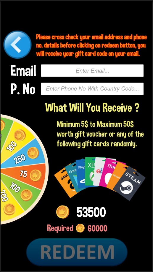 The Wheel of Happiness game lets you get the gift vouchers and gift cards worth of MINIMUM 5$ upon redemption of your coins. all you have to do is just spin the wheel of Happiness 10 times daily till minimum withdraw coins!