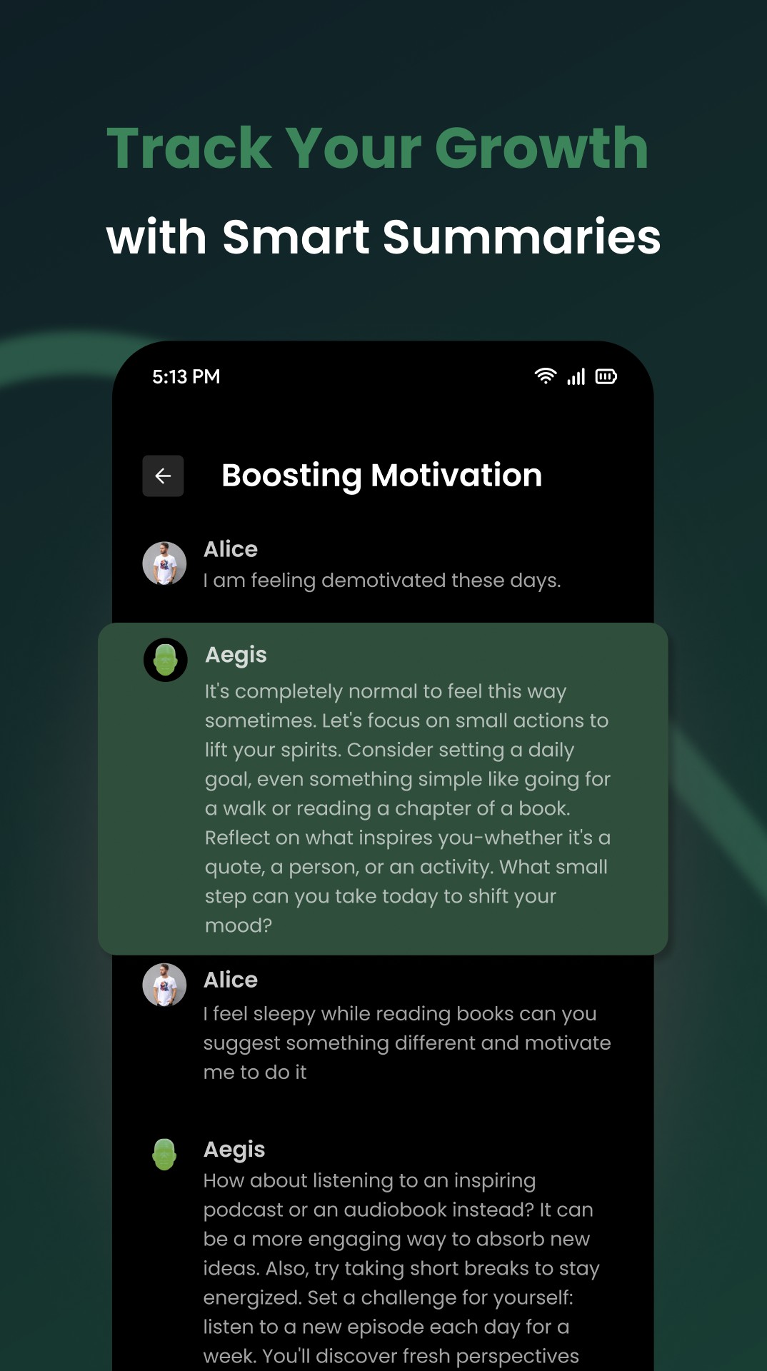 Through its realistic voice interaction, it makes a trusted connection with the users, which makes you feel comfortable sharing your insecurities and challenges. Alongside listening and mentoring, it also transcribes and summarizes the individual conversation as well as the entire experience, to help you keep track of your growth journey, ultimately working as your own journal, making you more self-aware.