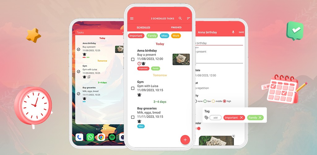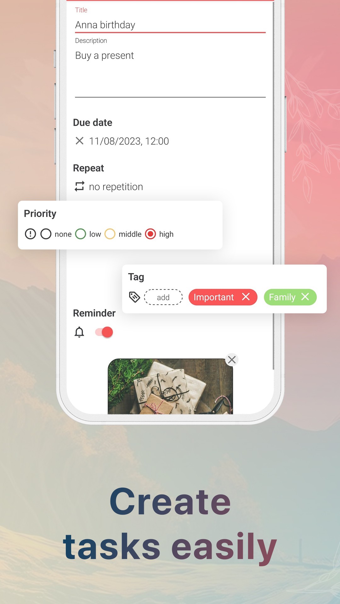 You can enhance all your to-dos with priorities, tags, voice notes, attachments (images, PDFs), and (repeating) reminders. The clear widget for your home screen adds even more productivity, allowing you to check off tasks or create new ones directly.