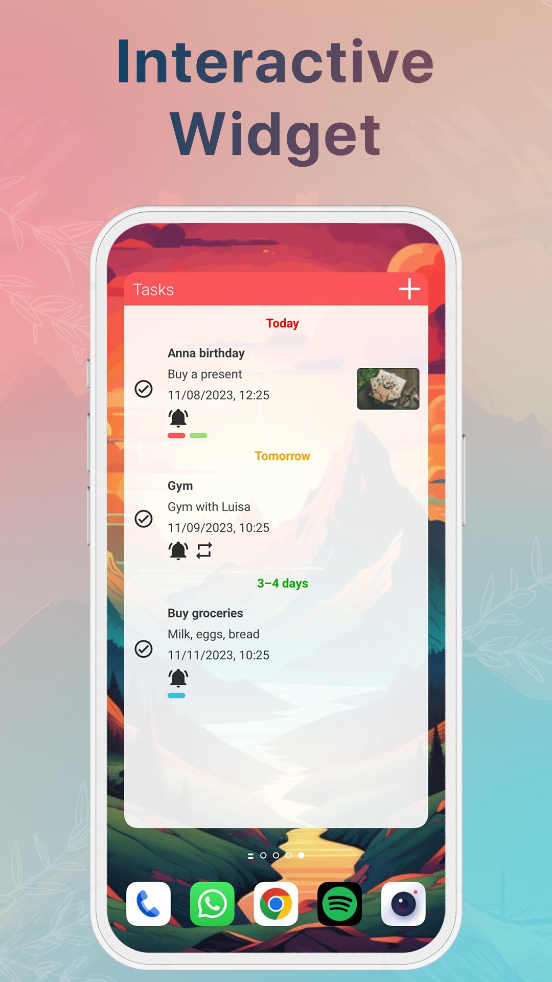 Widget Add the task list to your home screen for a comprehensive overview of your to-dos. The interactive widget allows you to check off and create tasks without opening the app.