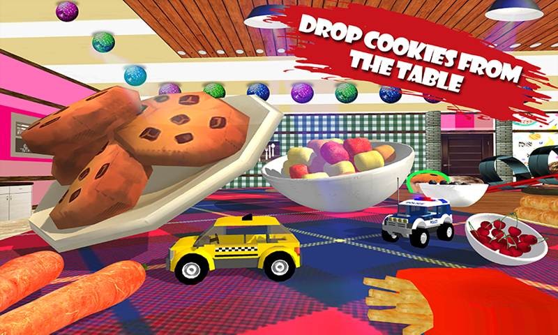 Smashing toy car food crush adventure is specially designed for all mini car RC racing game lovers and kitchen items smasher simulation fans. Race with an opponent car on the kitchen Food table and hit him hard to win. Drops delicious cookies from the dining to increase your points and unlock customizable vehicles. Extinguish the fire from the table with your firefighter truck.