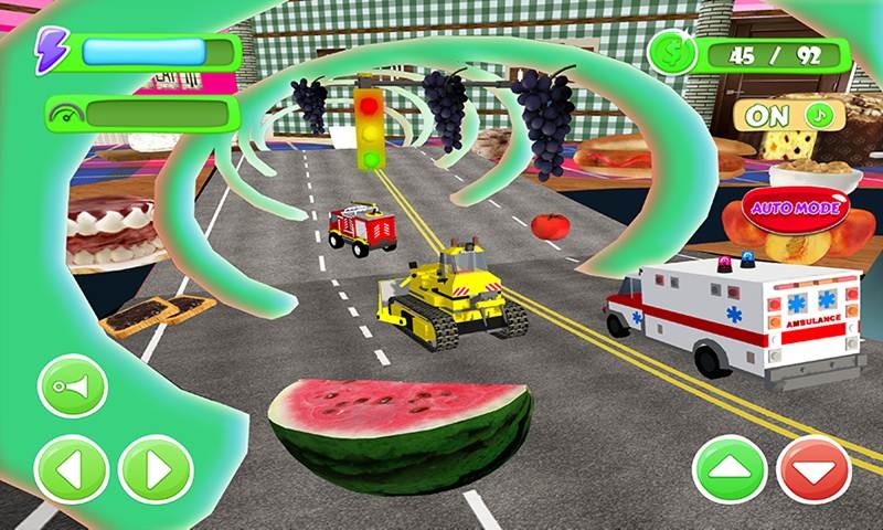 Beware from slippery hurdles like ketchup while racing & also drop target things from the food table. Collect the coins & drop the delicious fruits from the food table with the help of your mini toy car smasher. If you achieve the target, you will be rewarded with the double battery to drive the mini food toy car in the next level of this frenzy food simulator 2019.