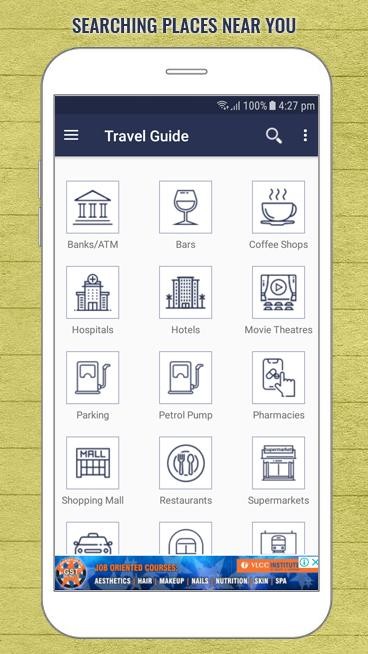 Travel Guide is a navigation application for helping people when traveling to different city. It displays places near to user's current location based on selected category. Download the application to know Hotels, ATMs, Railway, Metro, Bars, Banks, Coffee Shops, Hospitals, Malls, Parking, Petrol Pump, Medical Stores, Restaurants, Supermarkets, Taxies, Train Station, Subway Station, Railway Trains Schedule and Metro Route. It is complete travel guide for you.