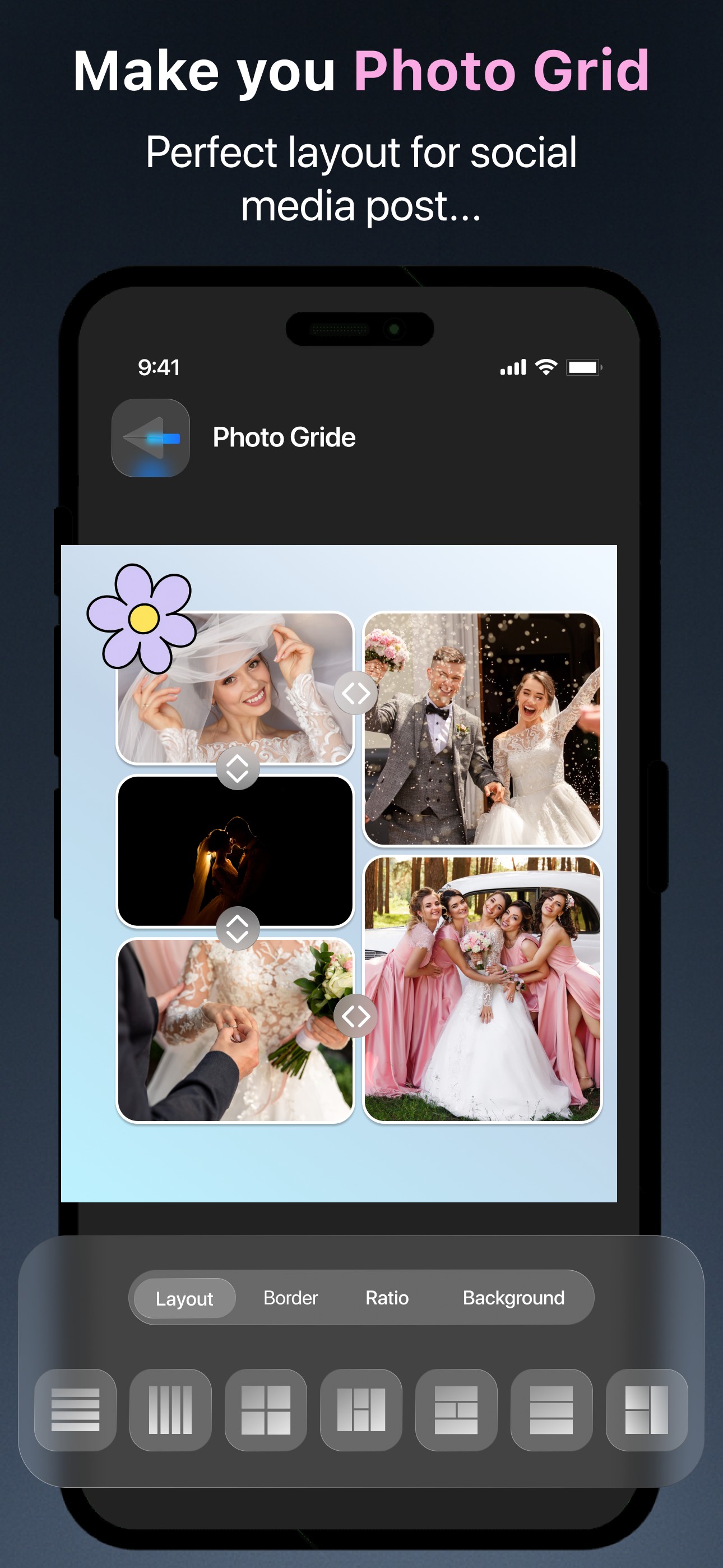 ● Collage Creator — ready-made layouts, drag-and-drop images, and custom spacing for perfect collages.