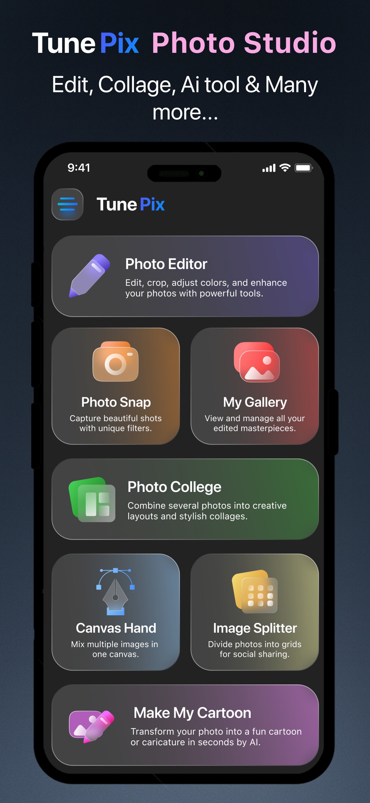 TunePix is the fast, fun AI-powered photo editor that helps you create standout photos in seconds. Remove backgrounds, apply pro retouching, turn portraits into cartoons, and build beautiful collages — all from one simple app.