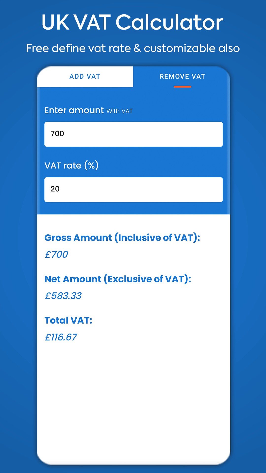 In addition to its simplicity, our app offers flexibility. You can set custom VAT rates to accommodate specific situations. This feature ensures that you can calculate VAT accurately, even when dealing with unique tax rates or circumstances.