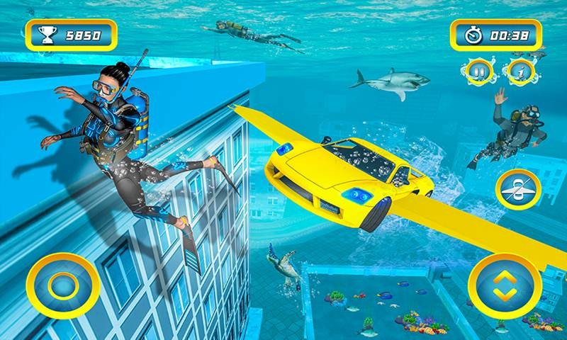 Enjoy the beauty of marine water landscapes and speed up on an especially futuristic cars to complete the level before time. Rescue the city civilians from the building top and drop them on their destination point in the undersea world while playing this underwater city ultimate flying car stunts simulator. Be vigilant from hungry sharks and watch out from the underwater opponents.