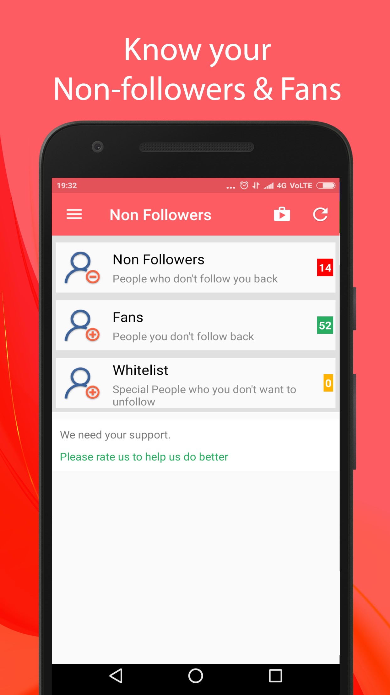 With Unfollow for Instagram, you can easily find a list of all users who do not follow your account on instagram but whom you follow. While tracking non-followers, the app also lets you unfollow these users. You can either unfollow a single user or unfollow multiple users. So, if you are asking yourself - Who unfollowed me on instagram?, just start using this Unfollow for Instagram to find out who unfollowed you. This app does not increase your followers on instagram. It only tracks users who do not follow you back on instagram and allows you to unfollow them.