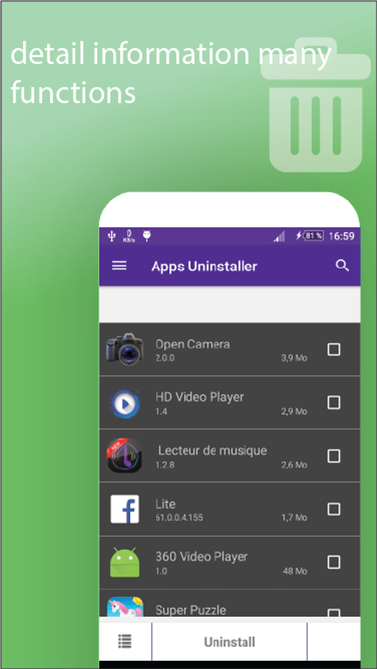 Uninstaller - Light, Easy & Fast App uninstall is very useful especially when you want to delete apps with large size such as social networks apps or 3d games. With a finger selection of the apps you aim to uninstall and the tool will easy uninstall and delete apps selected.