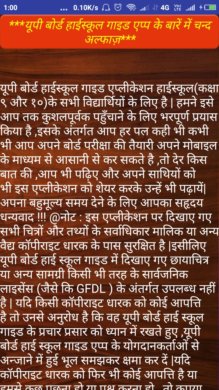 "यूपी बोर्ड हाईस्कूल गाइड" एप्लीकेशन हाईस्कूल(कक्षा ९ और १०)के सभी विद्यार्थियों के लिए है | हमने इसे आप तक कुशलपूर्वक पहुँचाने के लिए भरपूर्ण प्रयास किया है ,इसके अंतर्गत आप हर पल कही भी कभी भी "आप अपने बोर्ड परीक्षा की तैयारी" अपने मोबाइल के माध्यम से आसानी से कर सकते है ,तो देर किस बात की ,आप भी पढ़िए और अपने साथियों को भी इस एप्लीकेशन को शेयर करके उन्हें भी पढ़ायें |