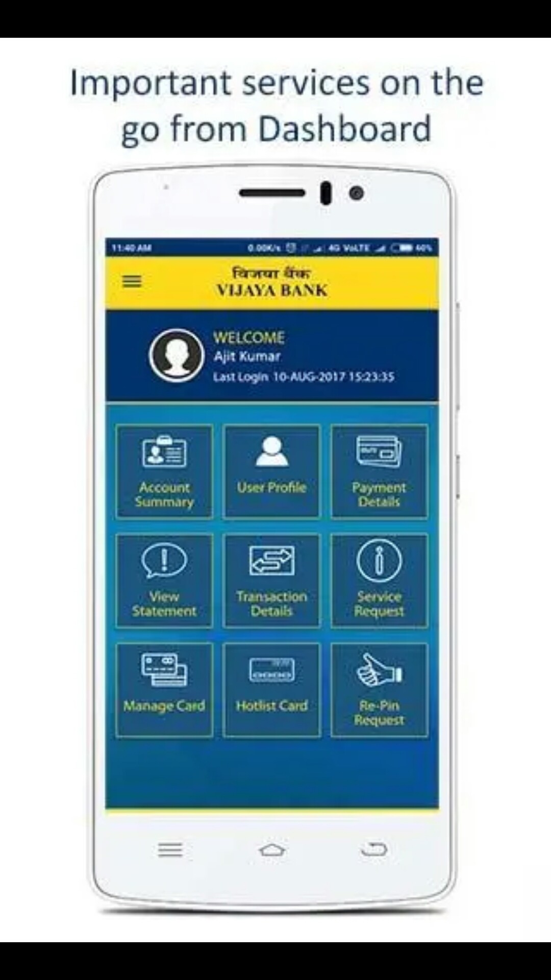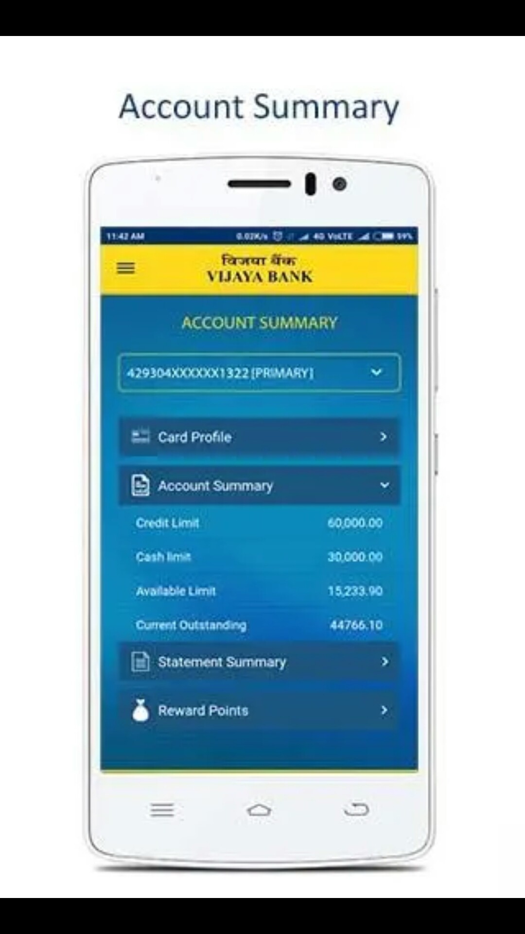 Vijaya Bank has developed a mobile application for its Credit Card customers in which the users can view their credit card transactions as well as control their credit card activities.